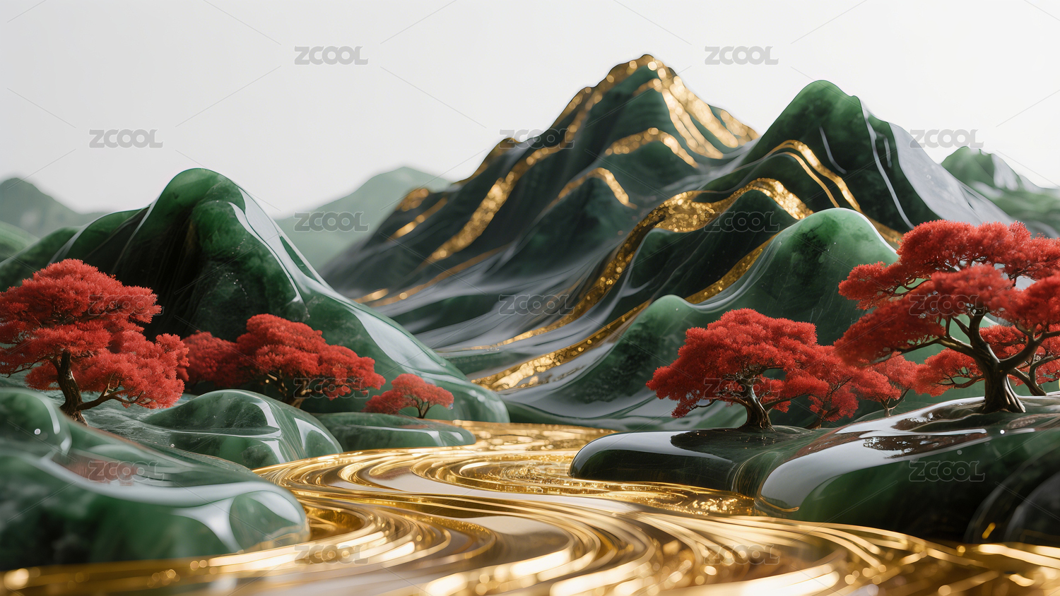 墨绿色,玉石,山脉,鎏金,河流,红色,松树,金色,商务,电商