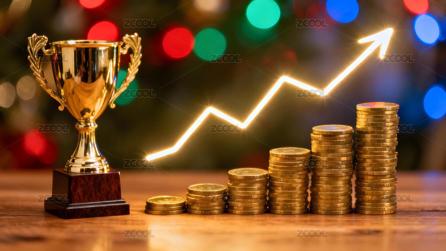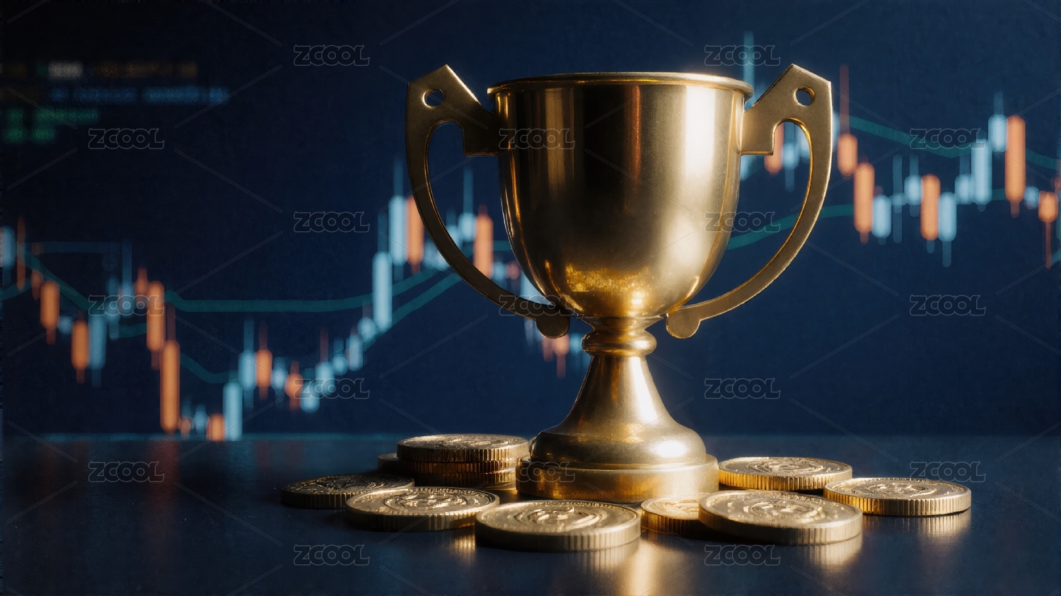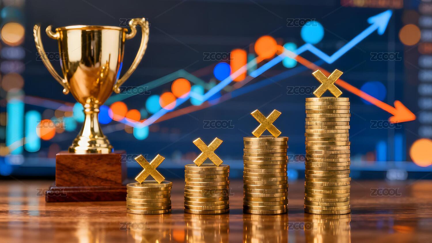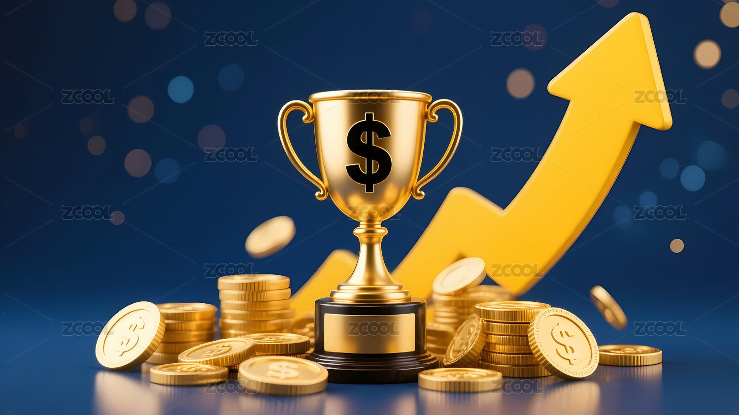背景,金色,深蓝,光斑,奖杯,美元,符号,箭头,金币,指向