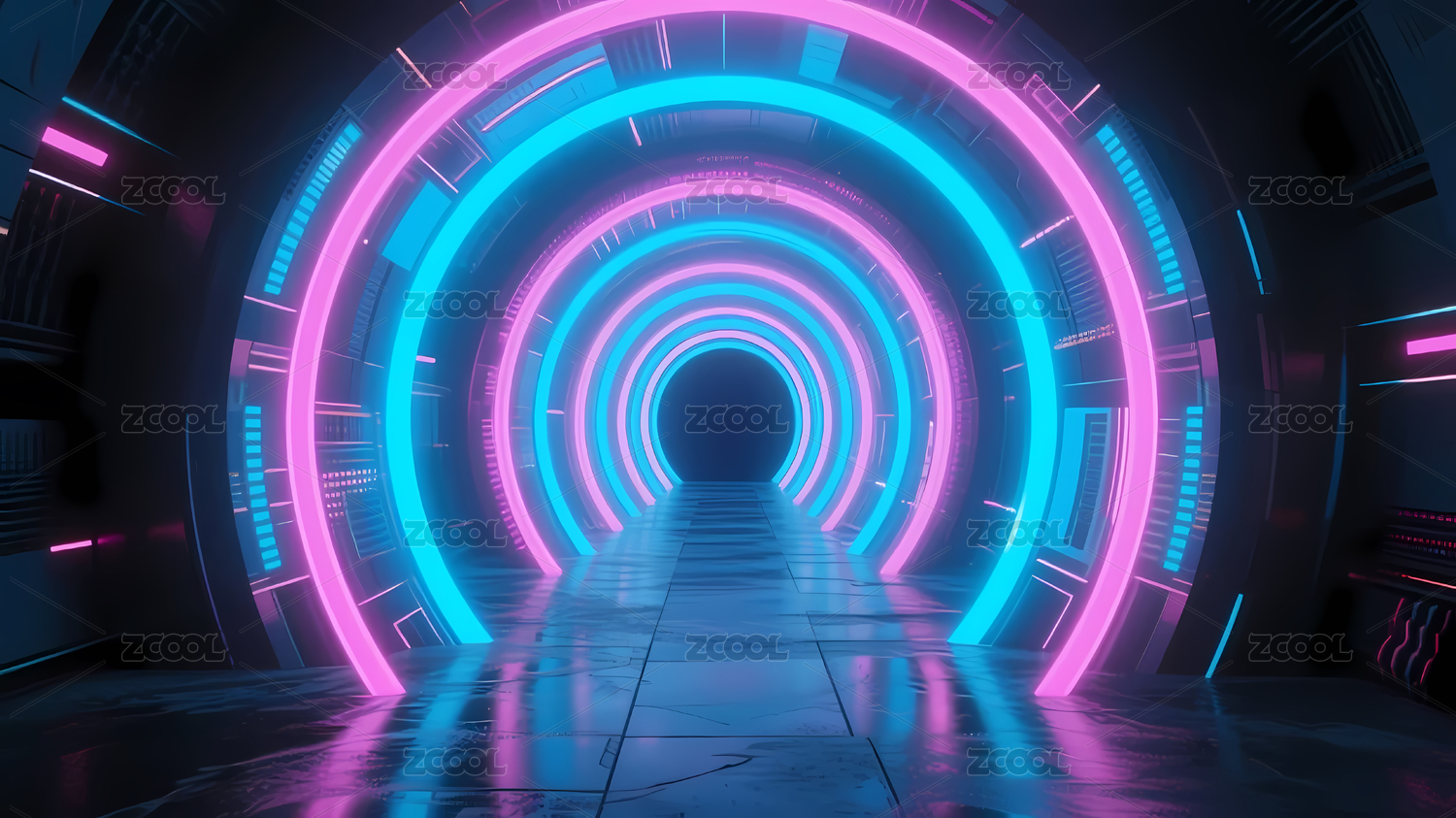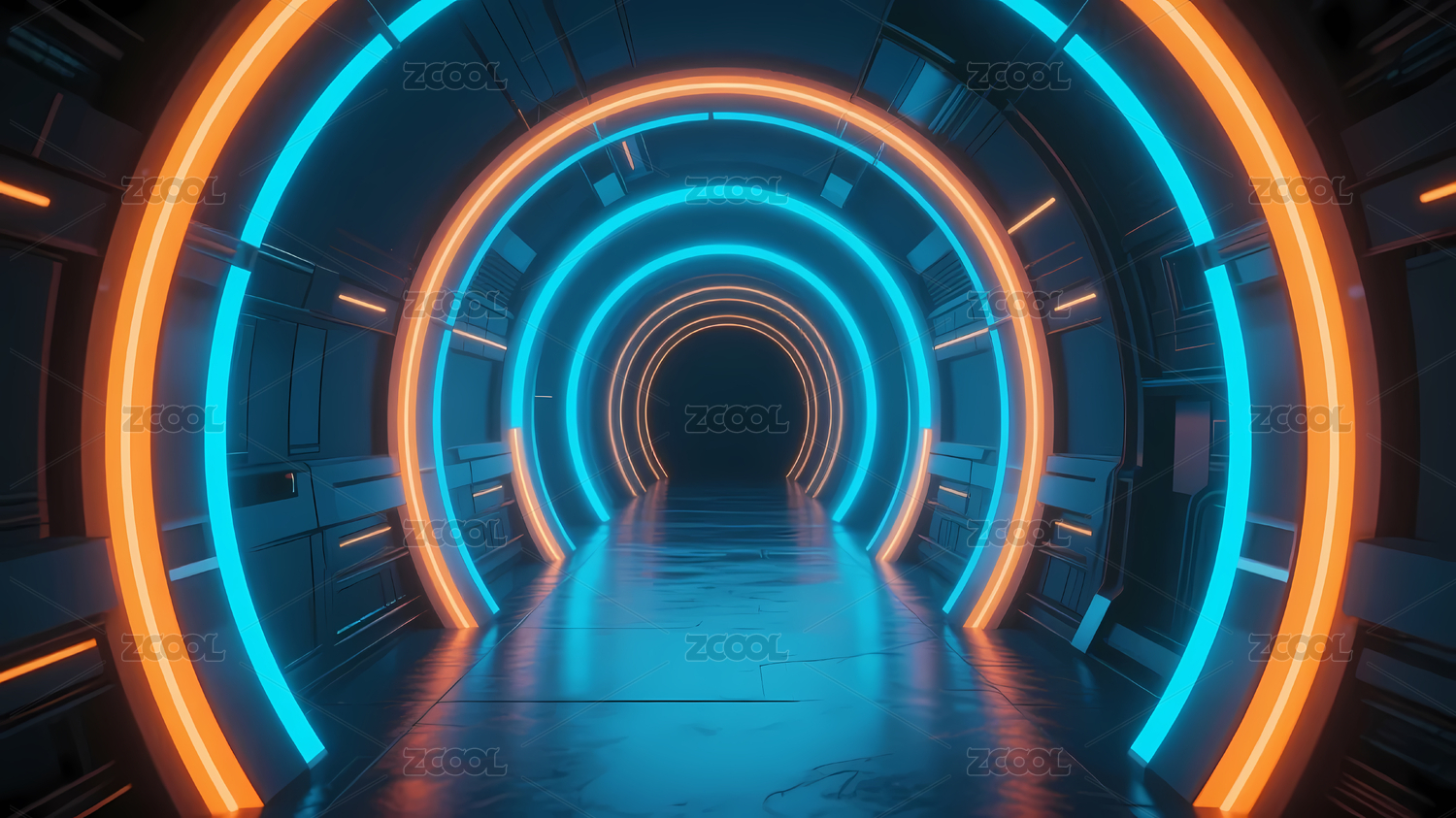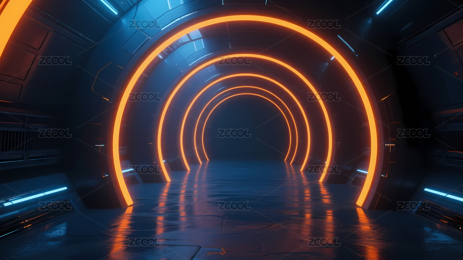 蓝色,背景,橙色,深色,光带,圆形,霓虹,隧道,墙壁,地面