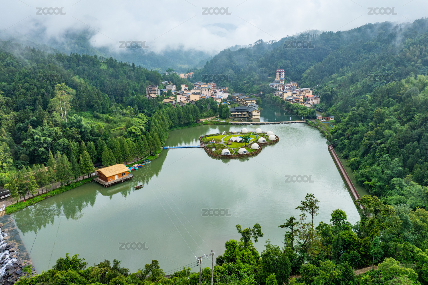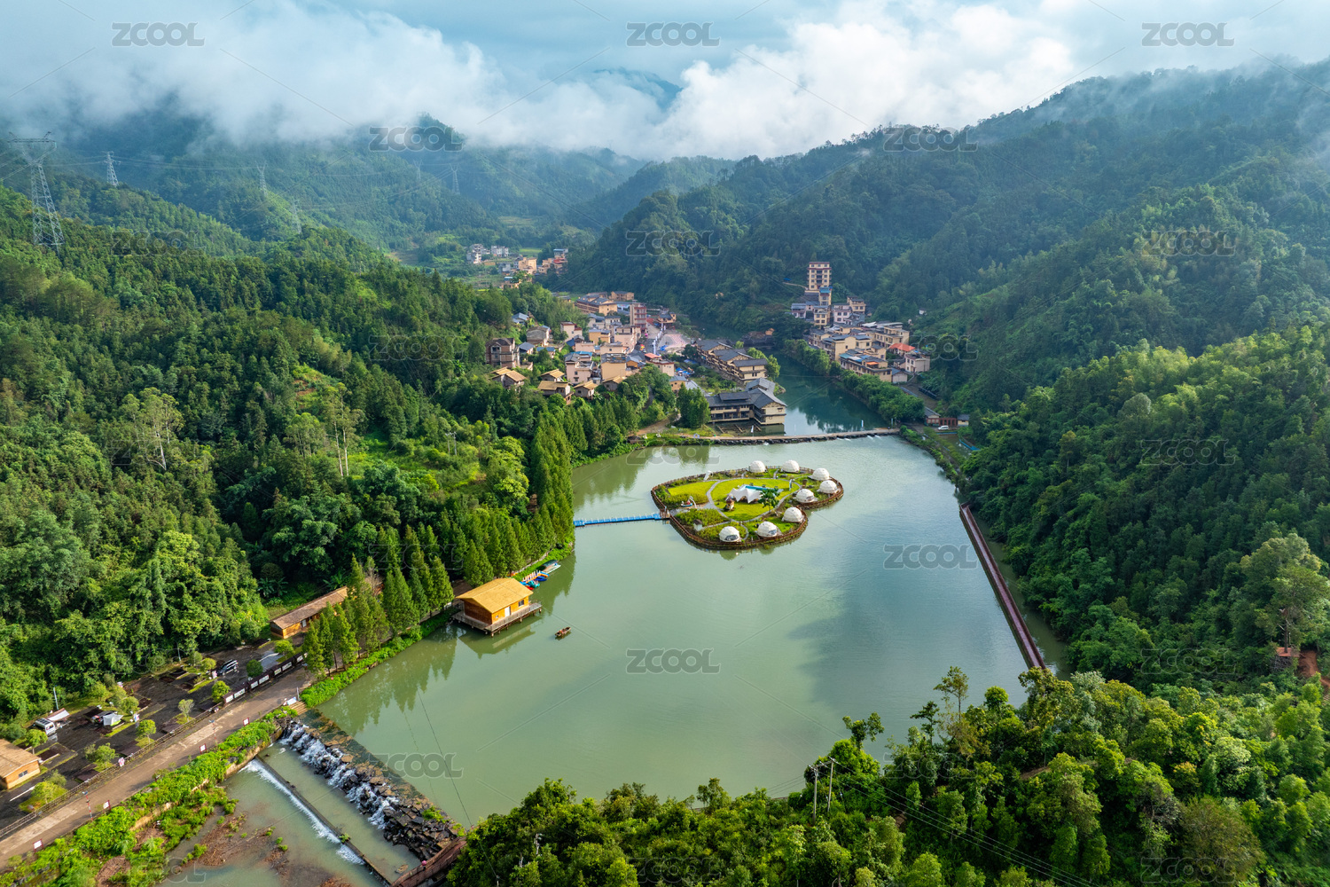 乡村旅游区,湖泊,河流,山景,雨后,村庄,民居,街道,车辆,自然风光