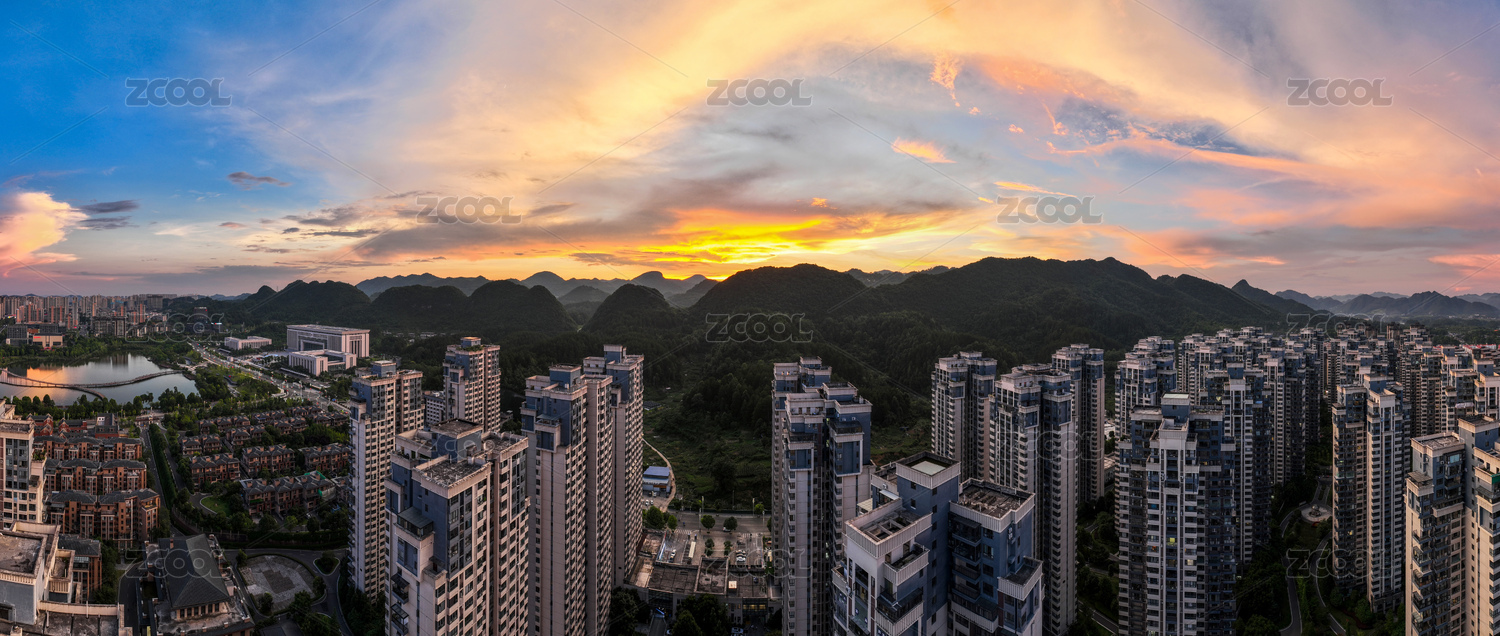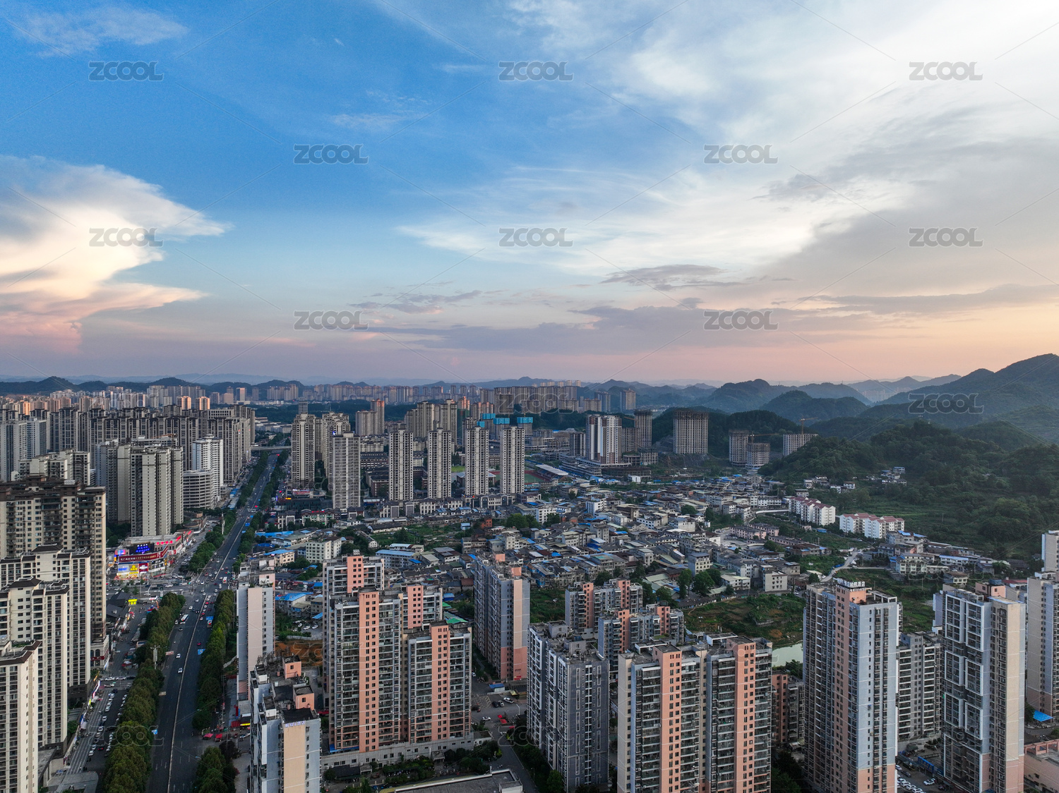 都市风景,航拍视角,高视角,夜晚,日落,全景,住宅区,城市,城市风光,多云天空