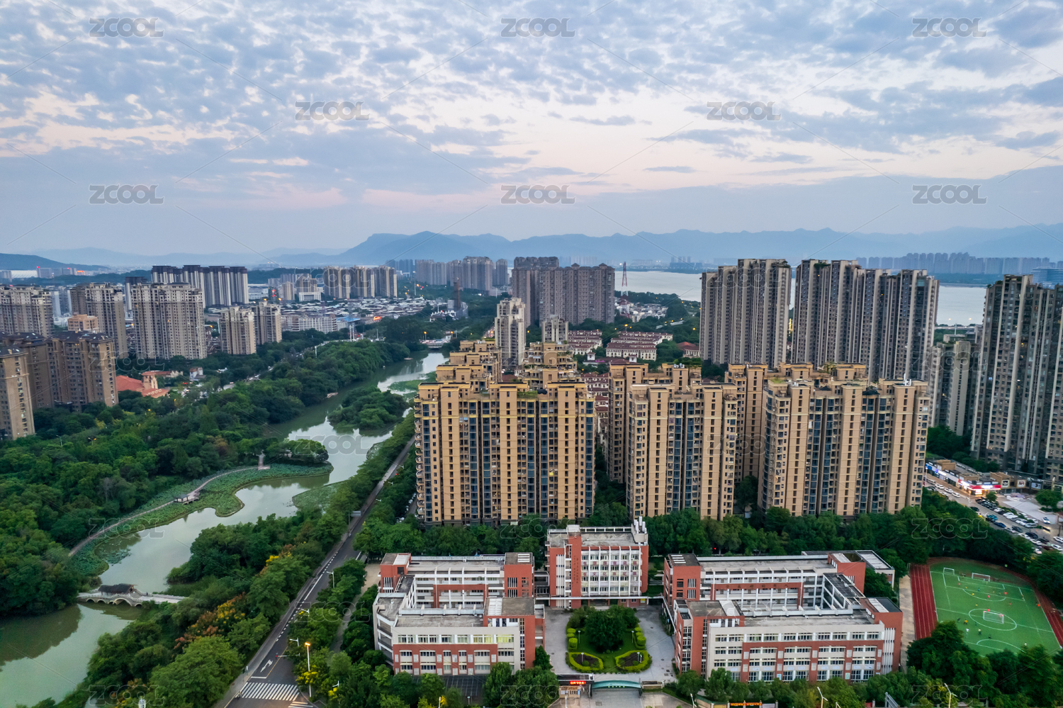 都市风景,航拍视角,高视角,夜晚,日落,全景,住宅区,城市,城市风光,多云天空