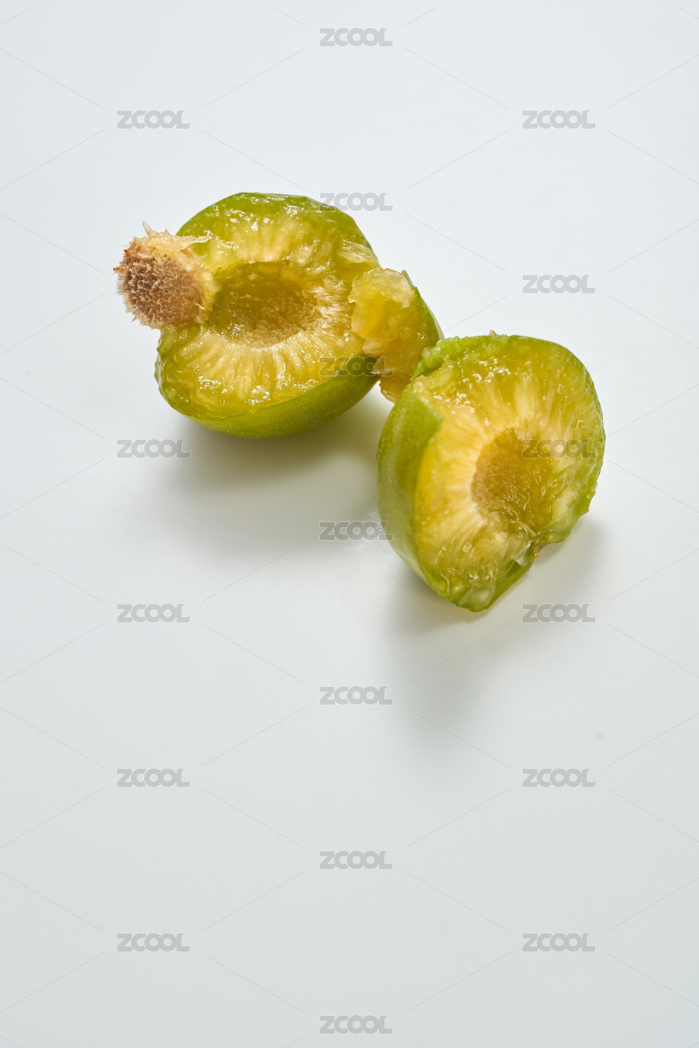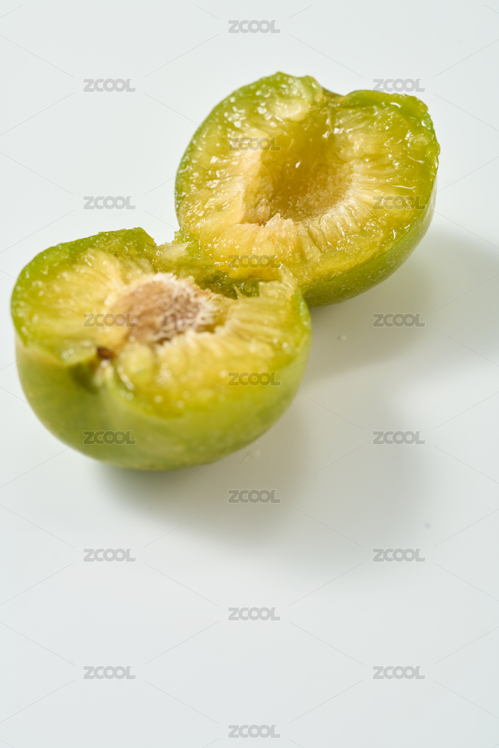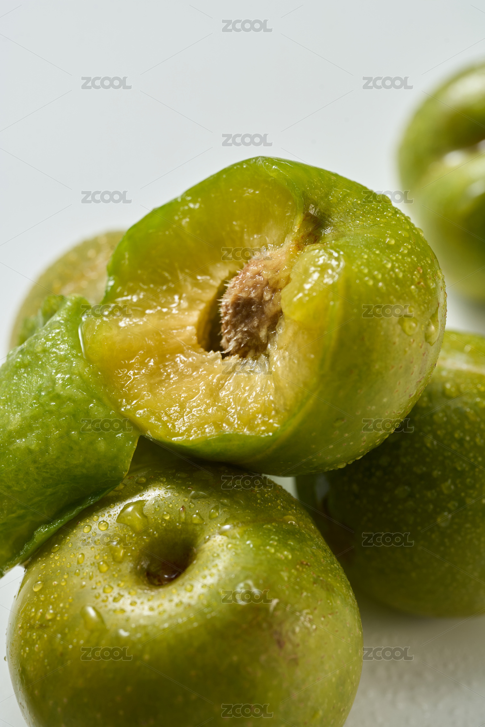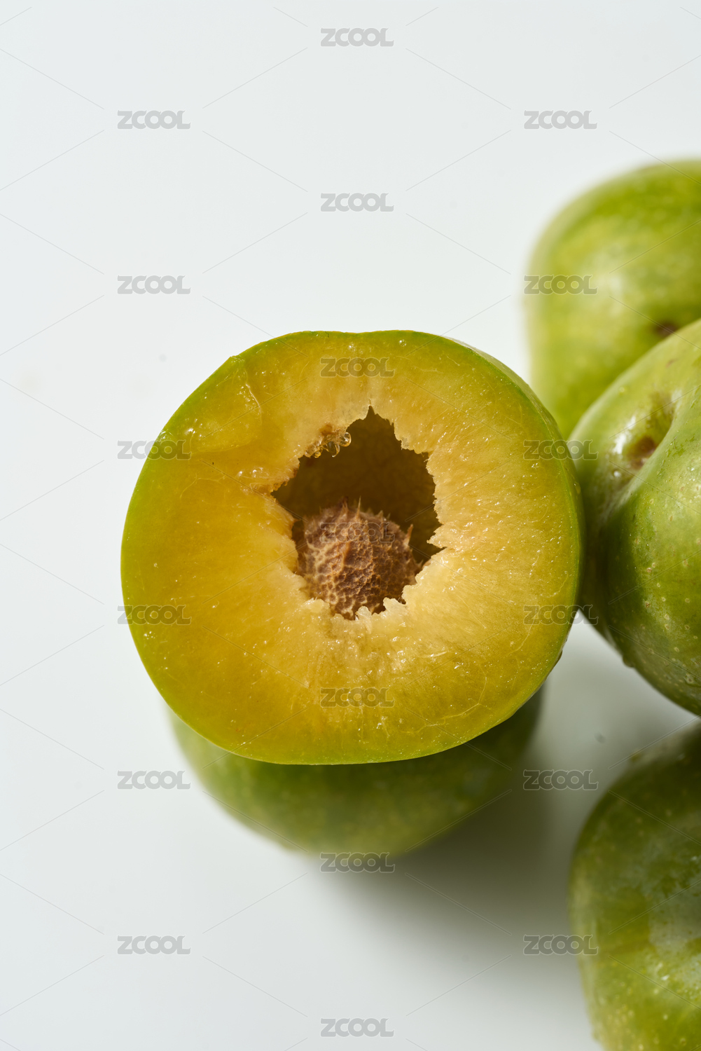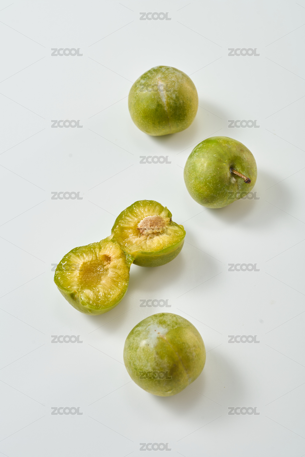 一堆新鲜的翠绿色脆李放在白色背景板上