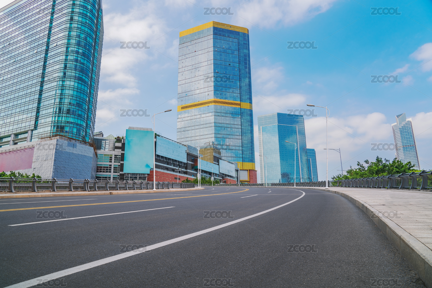 中国香港空旷的柏油路与现代城市建筑天际线全景