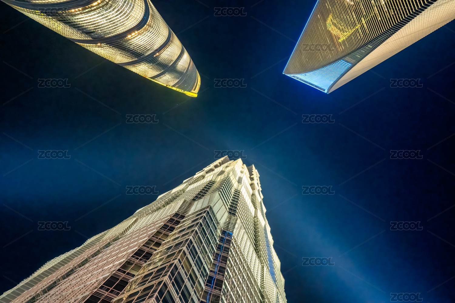 仰拍上海浦东摩天楼夜景