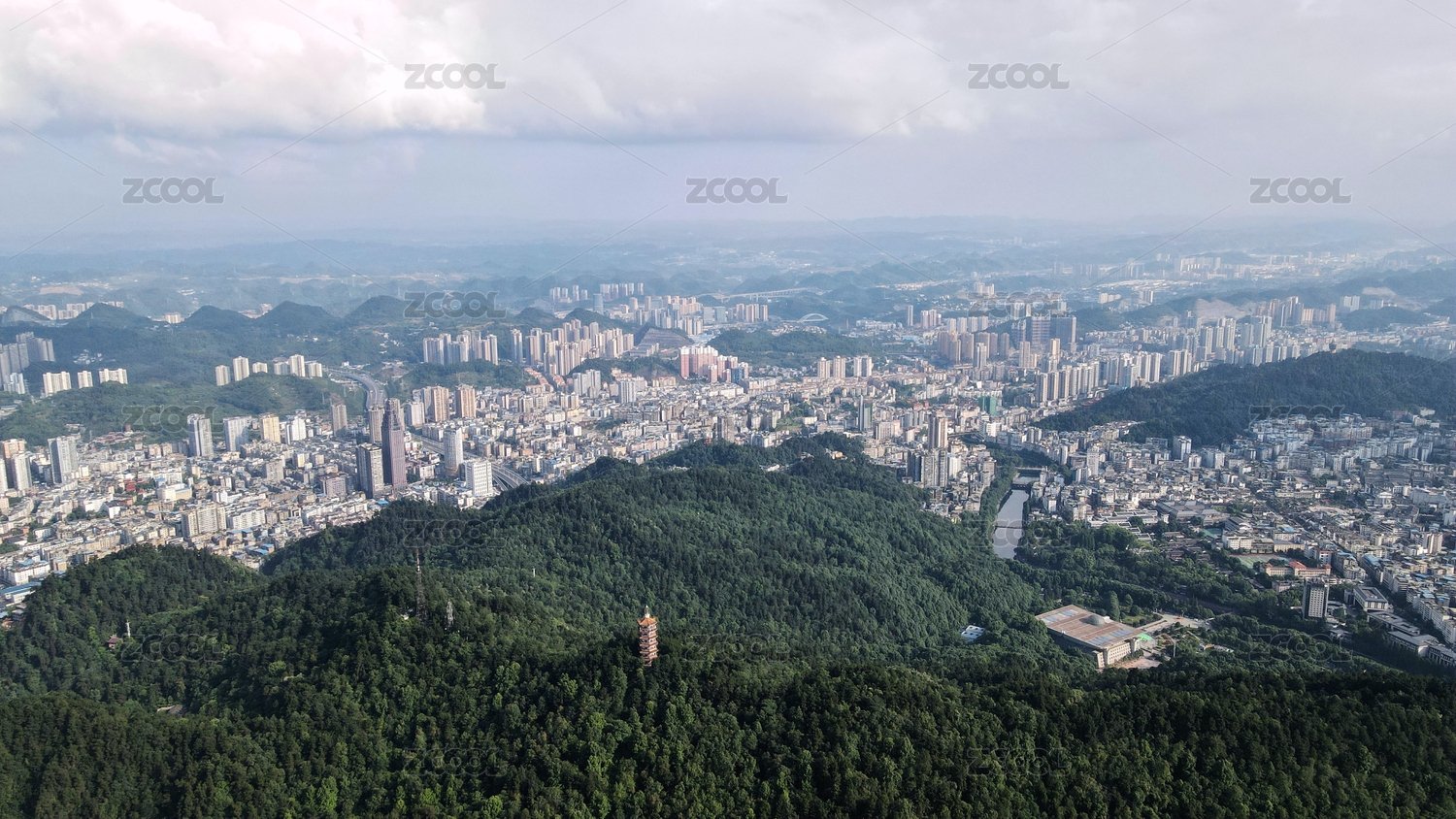 贵阳市黔灵山下的城市天际线航拍图