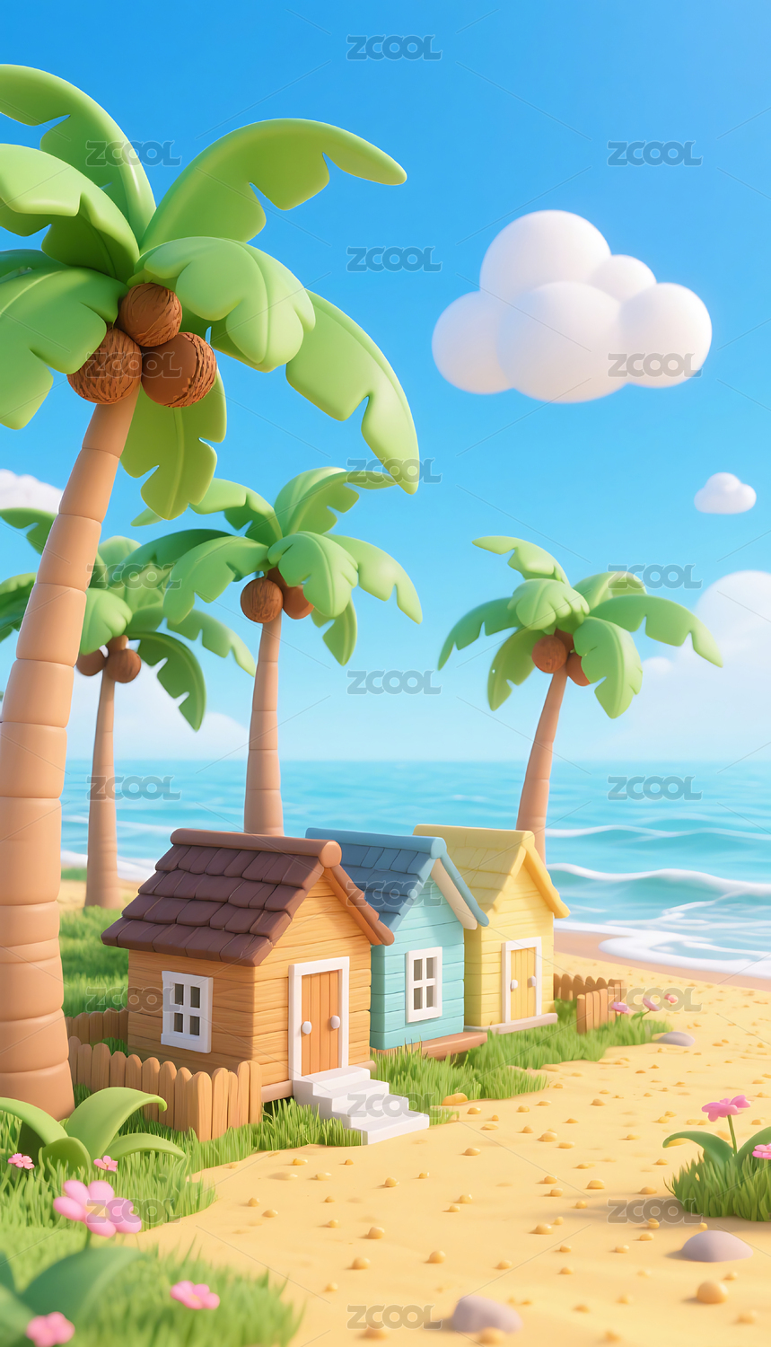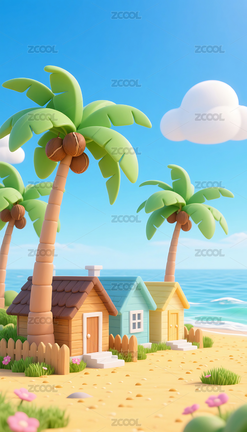 3D,卡通,海边,大海,沙滩,房屋,椰子树,插画,模型,清新