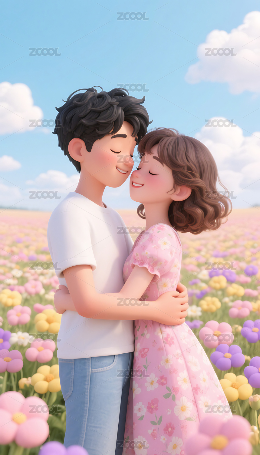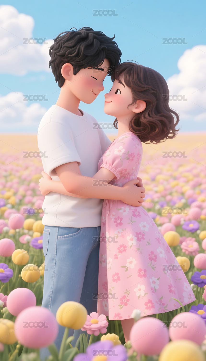 3D,情人节,情侣,拥抱,插画,模型,素材,幸福,花海