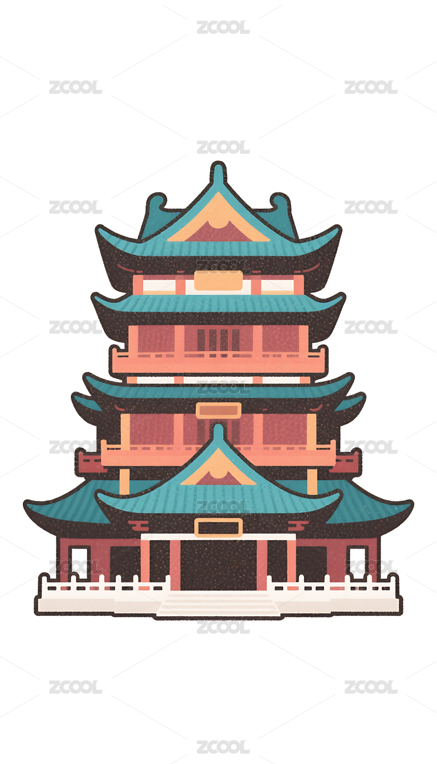 国潮卡通风格古建筑阁楼插画素材