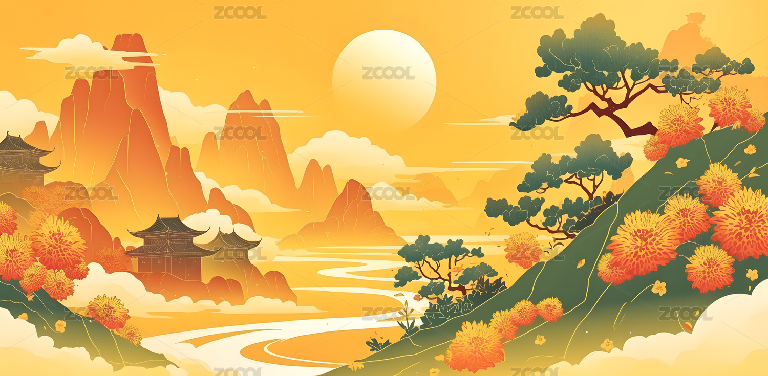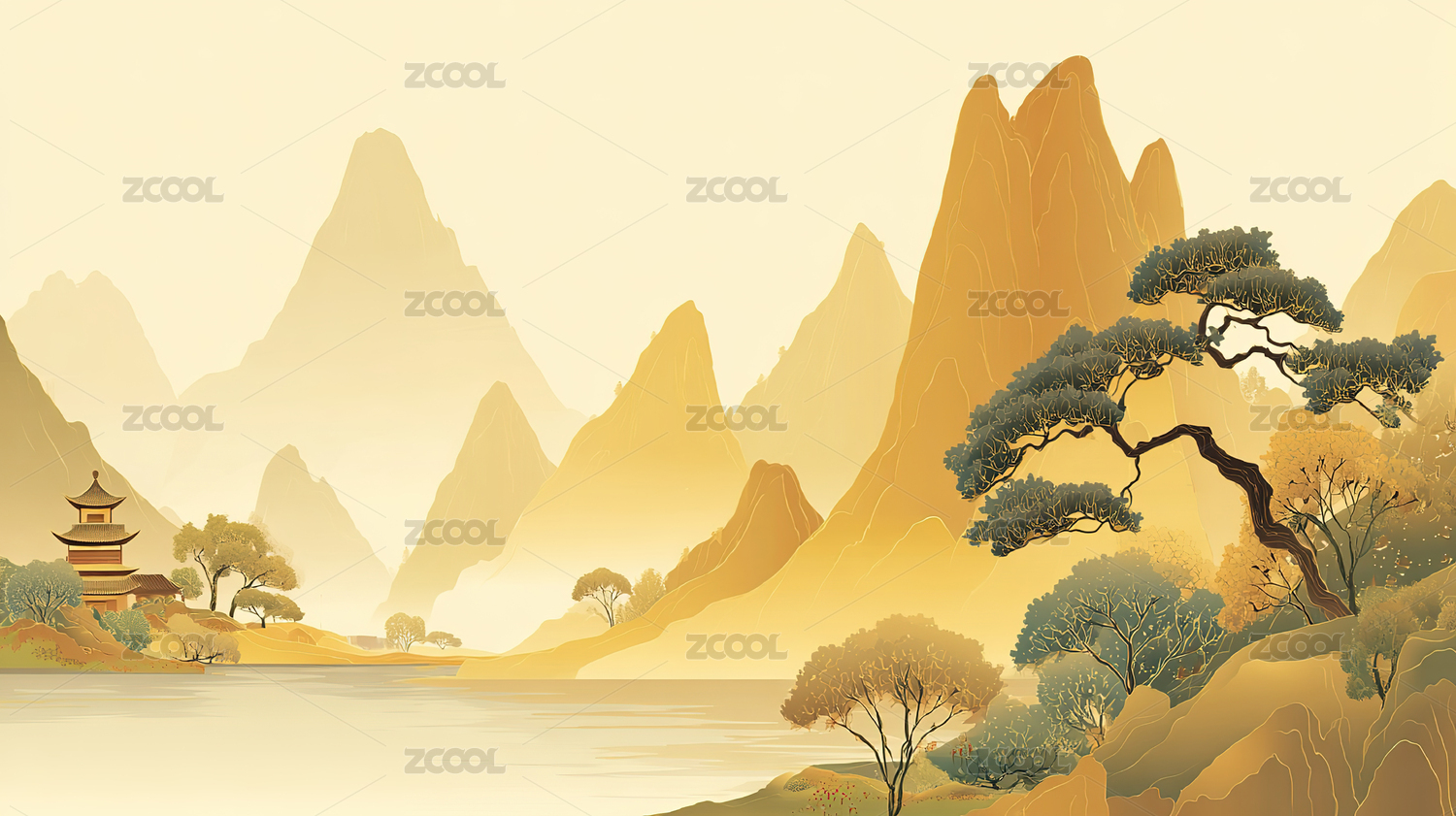 中国传统浅蓝色山水古风国风水墨画背景壁纸