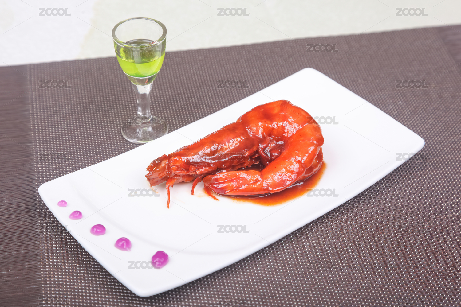 长方形瓷盘装的铁板野生明虾皇摆放在草垫上