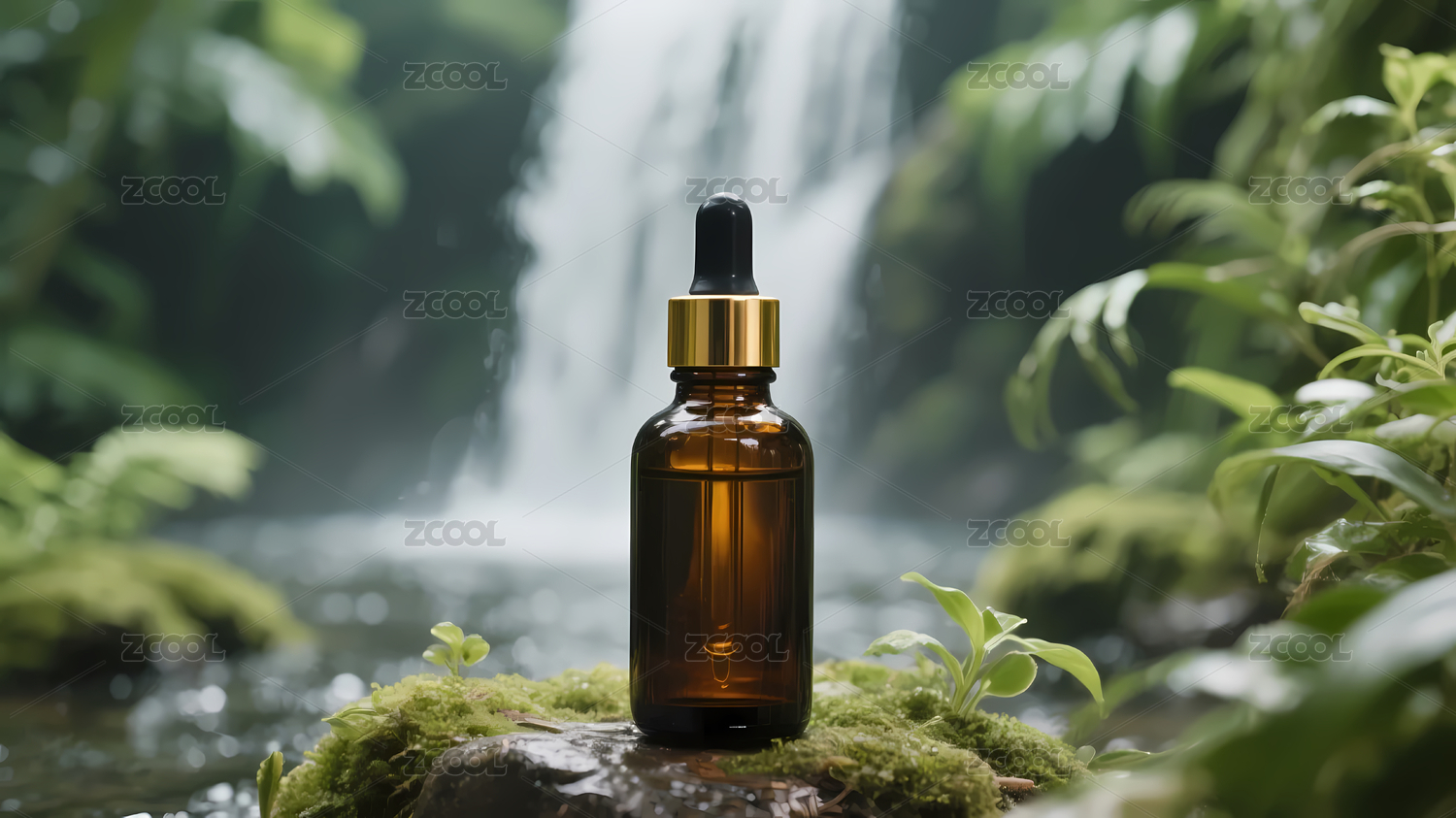 精油瓶立在青翠的苔藓上