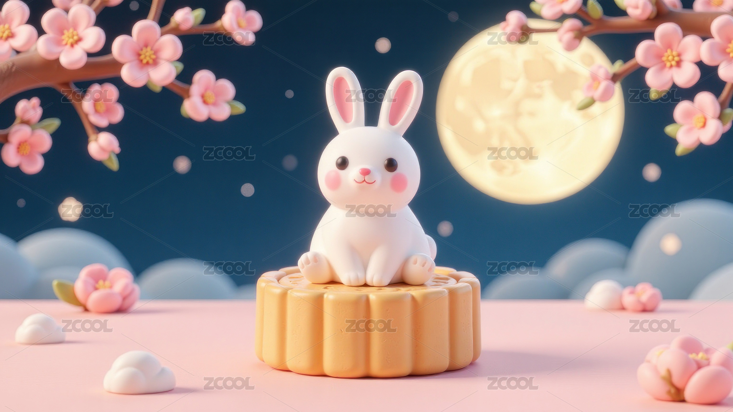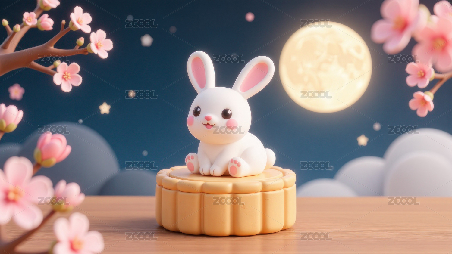 中秋节满月背景下正在吃月饼的可爱玉兔