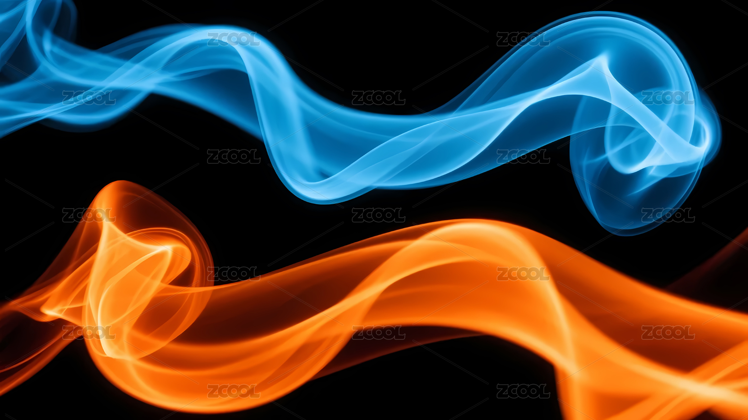 蓝色和橙色火焰状光波交汇,背景纯黑