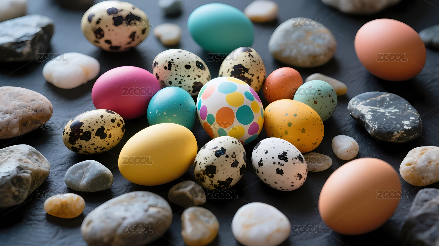 色彩斑斓鸡蛋散布黑色石板上