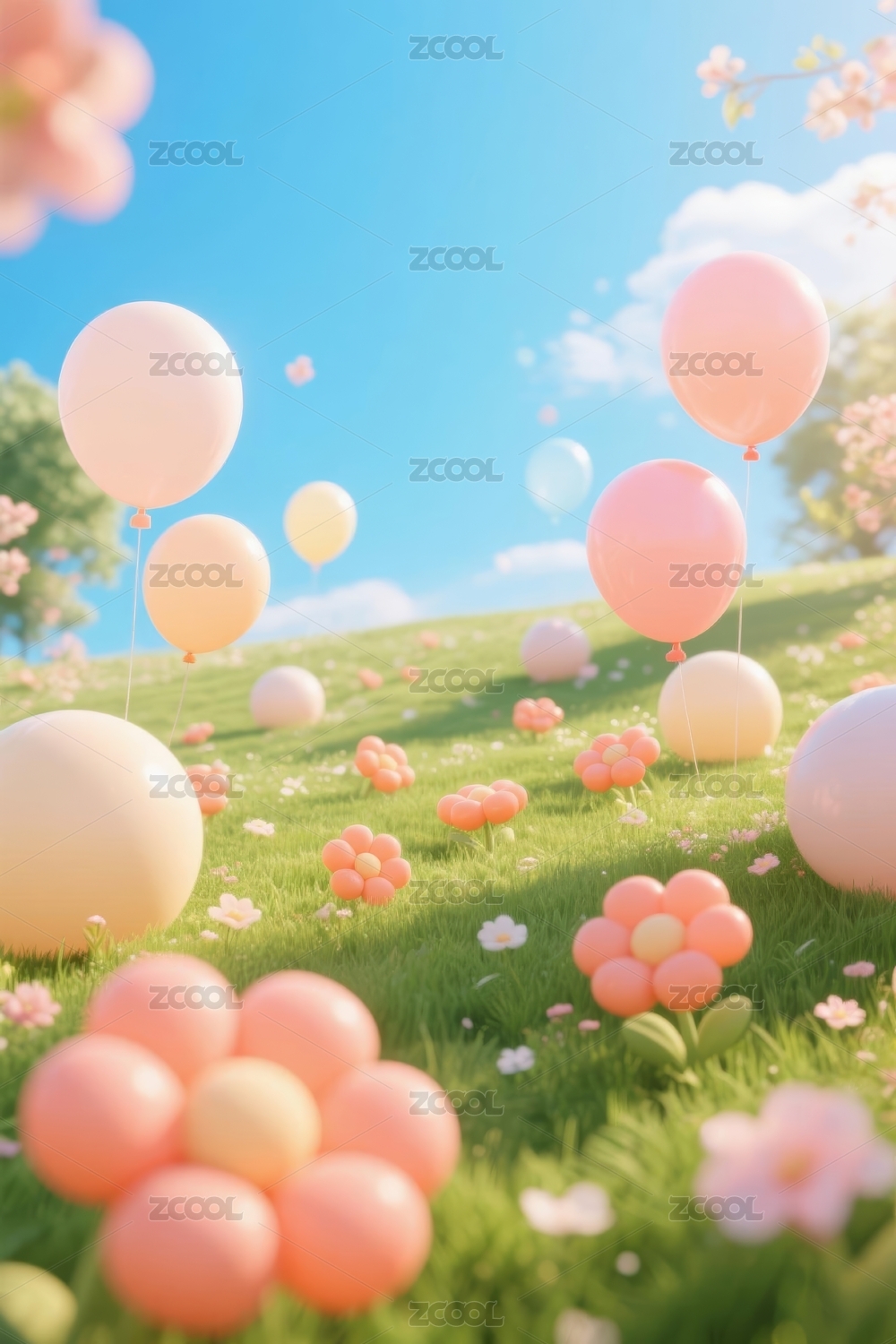 主视觉,商业,气球,花朵,梦幻,户外,场景,粉色,蓝天,草地