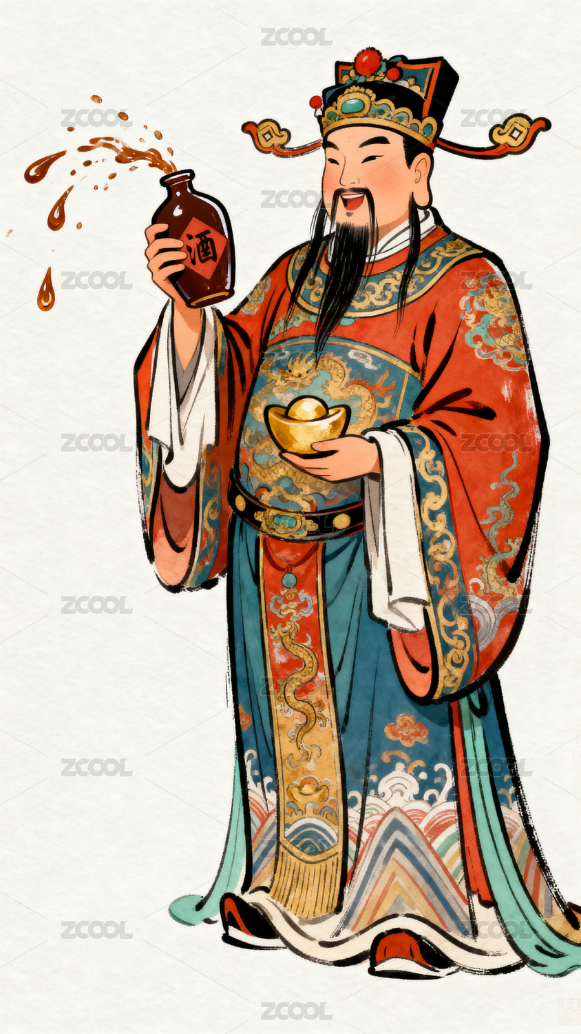 财神爷手持金元宝和酒瓶