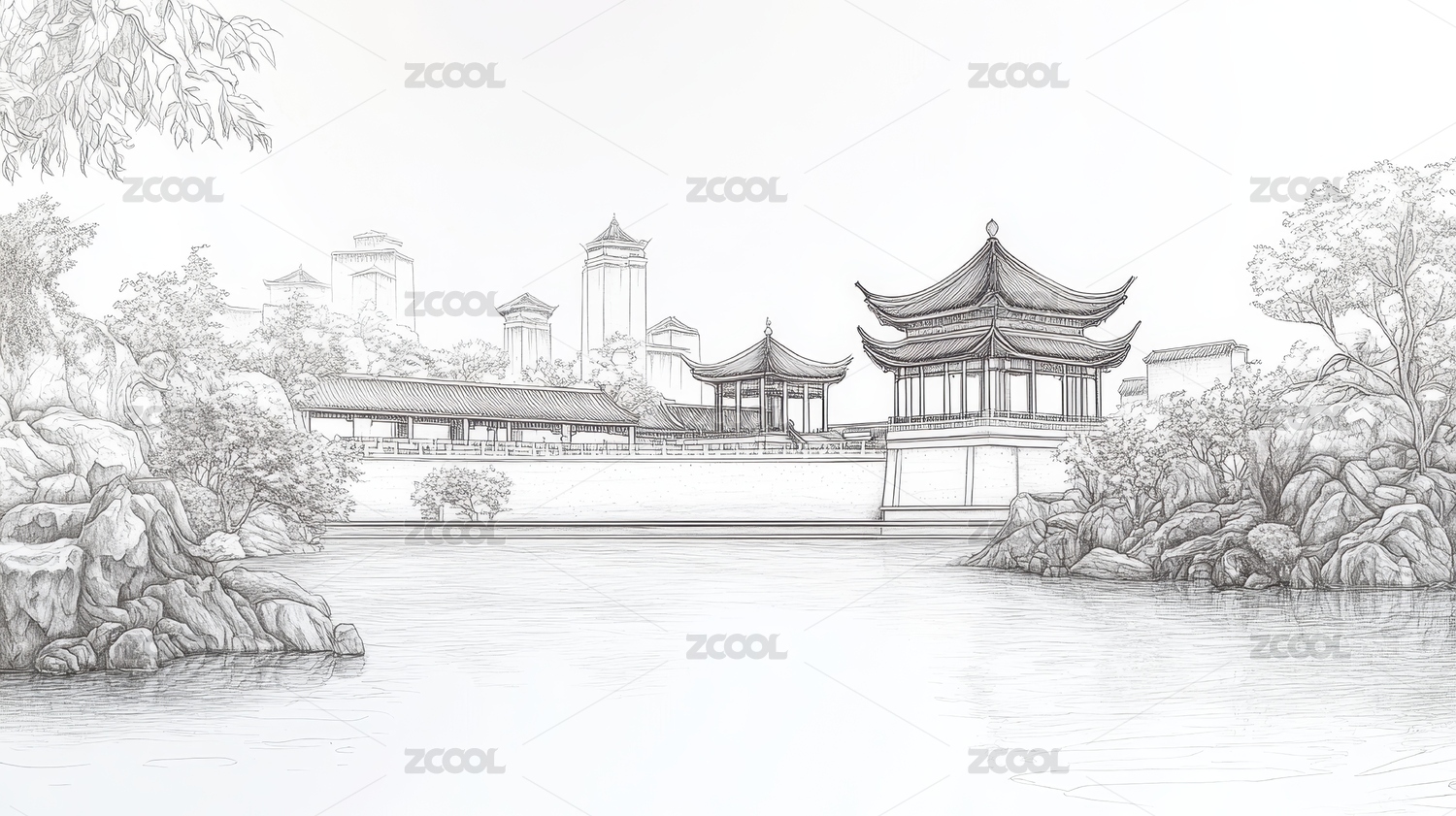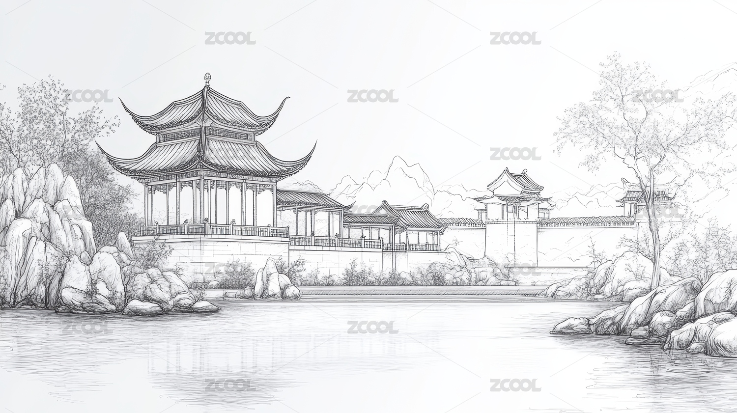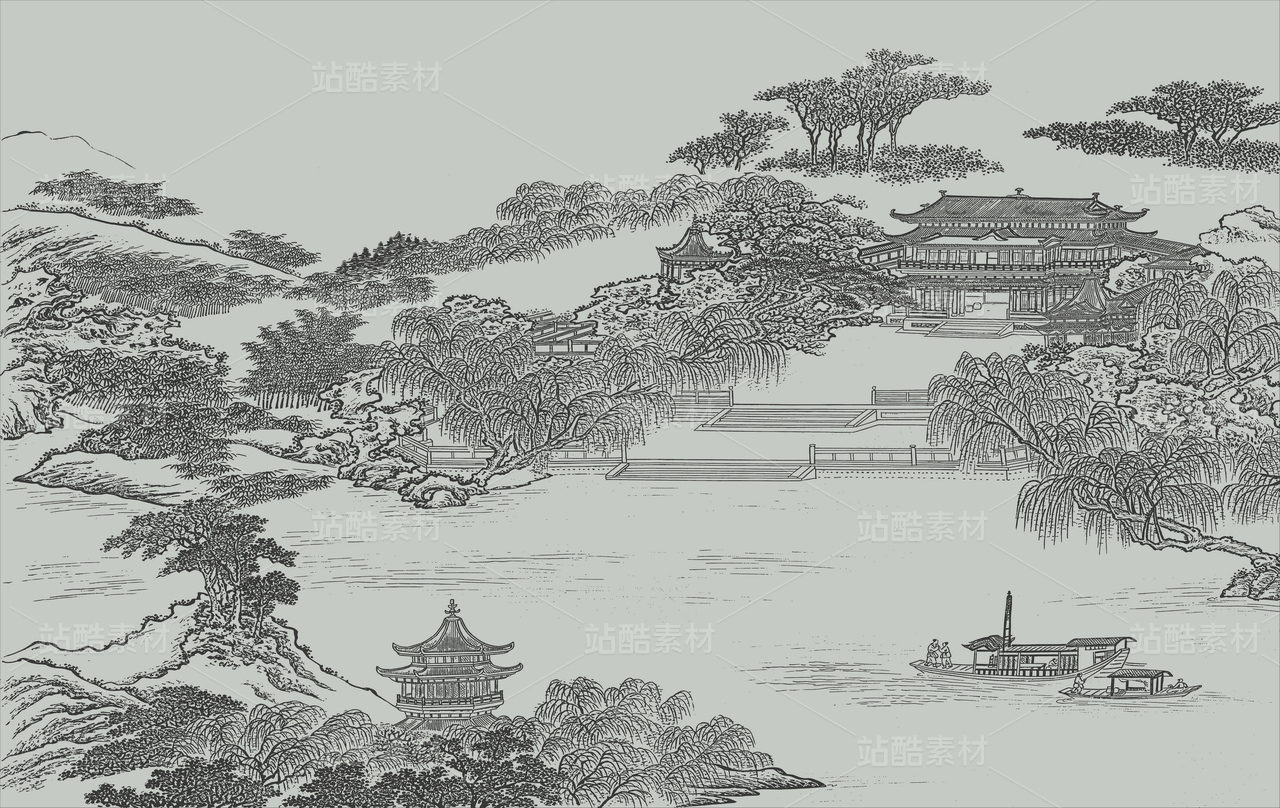白描风格山水环绕的中国古建筑