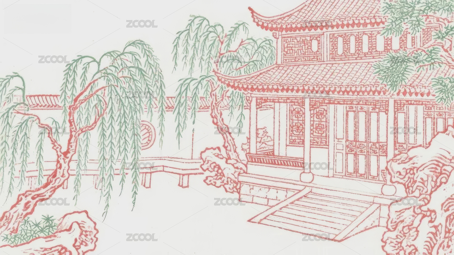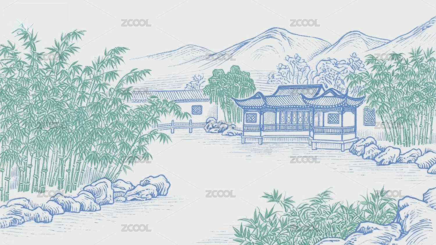 国风蓝白绿古建筑线稿画