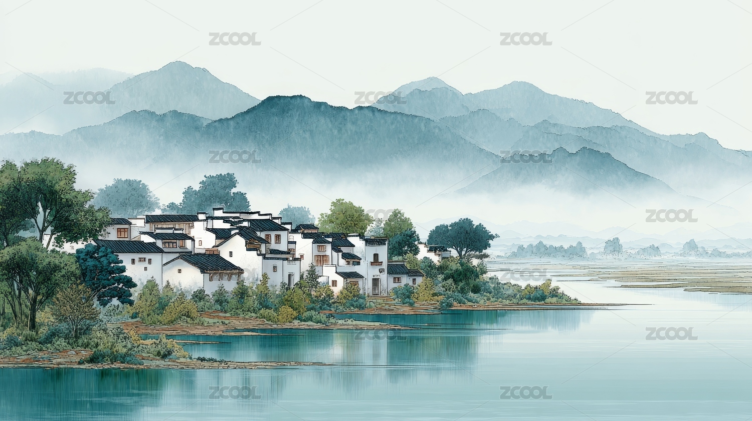 水墨风格河畔古村落