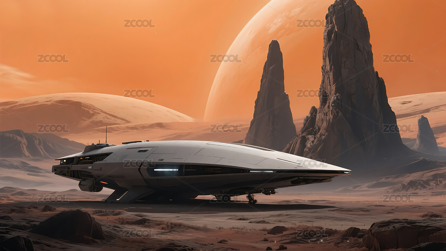 飞船环绕着红巨星的未来城市
