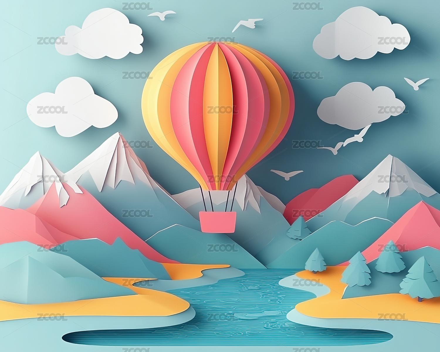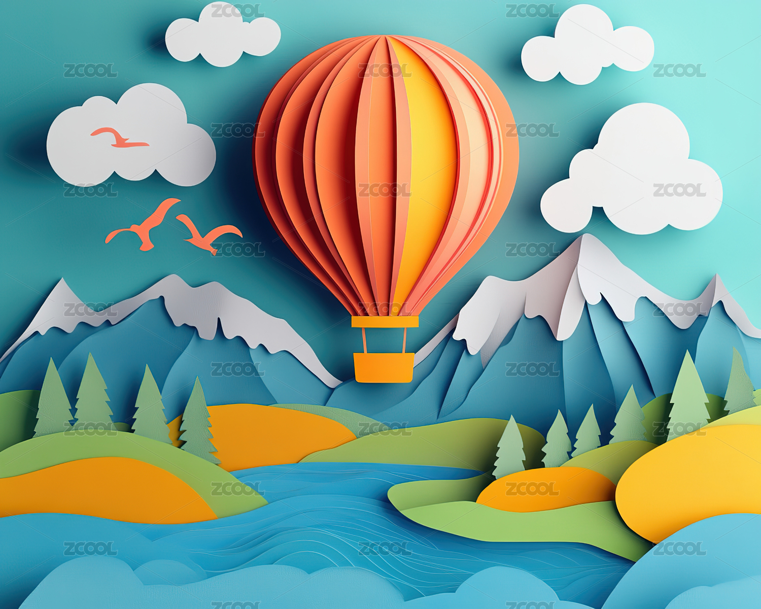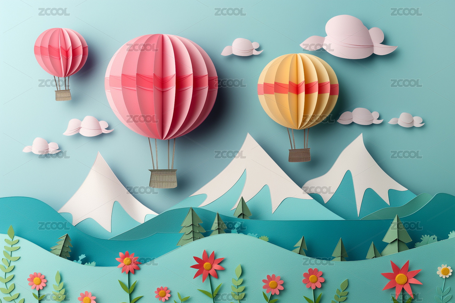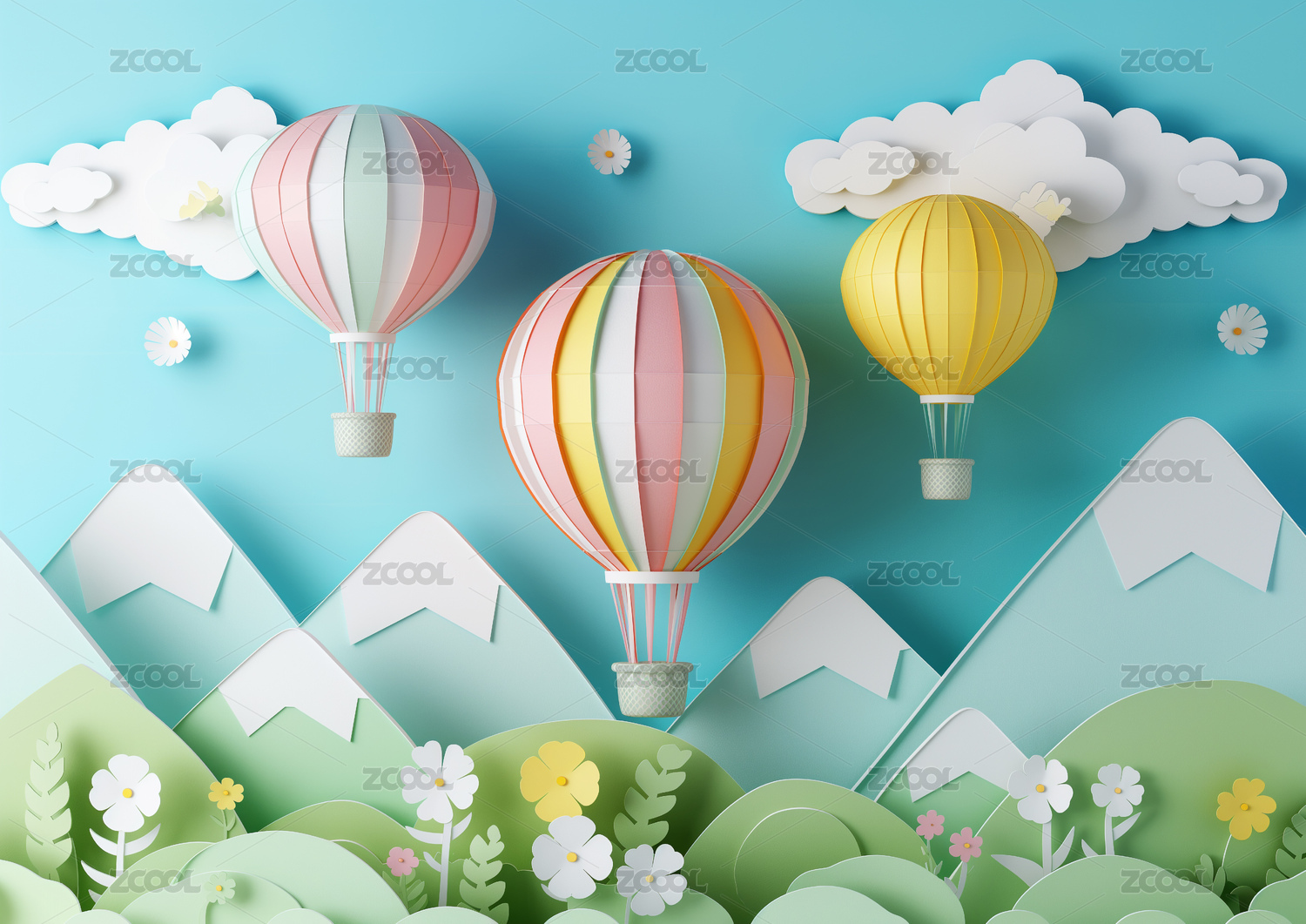 3D冒险旅行热气球飞行夏天卡通三维插画