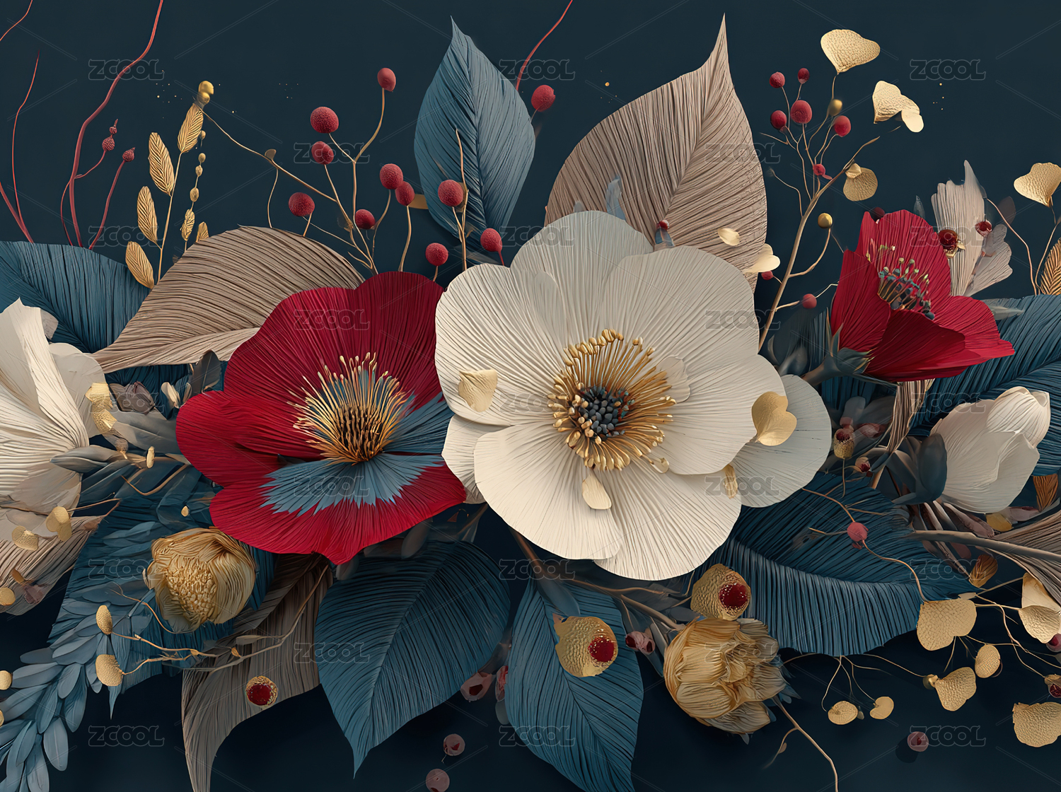 深蓝背景上的红白花卉装饰