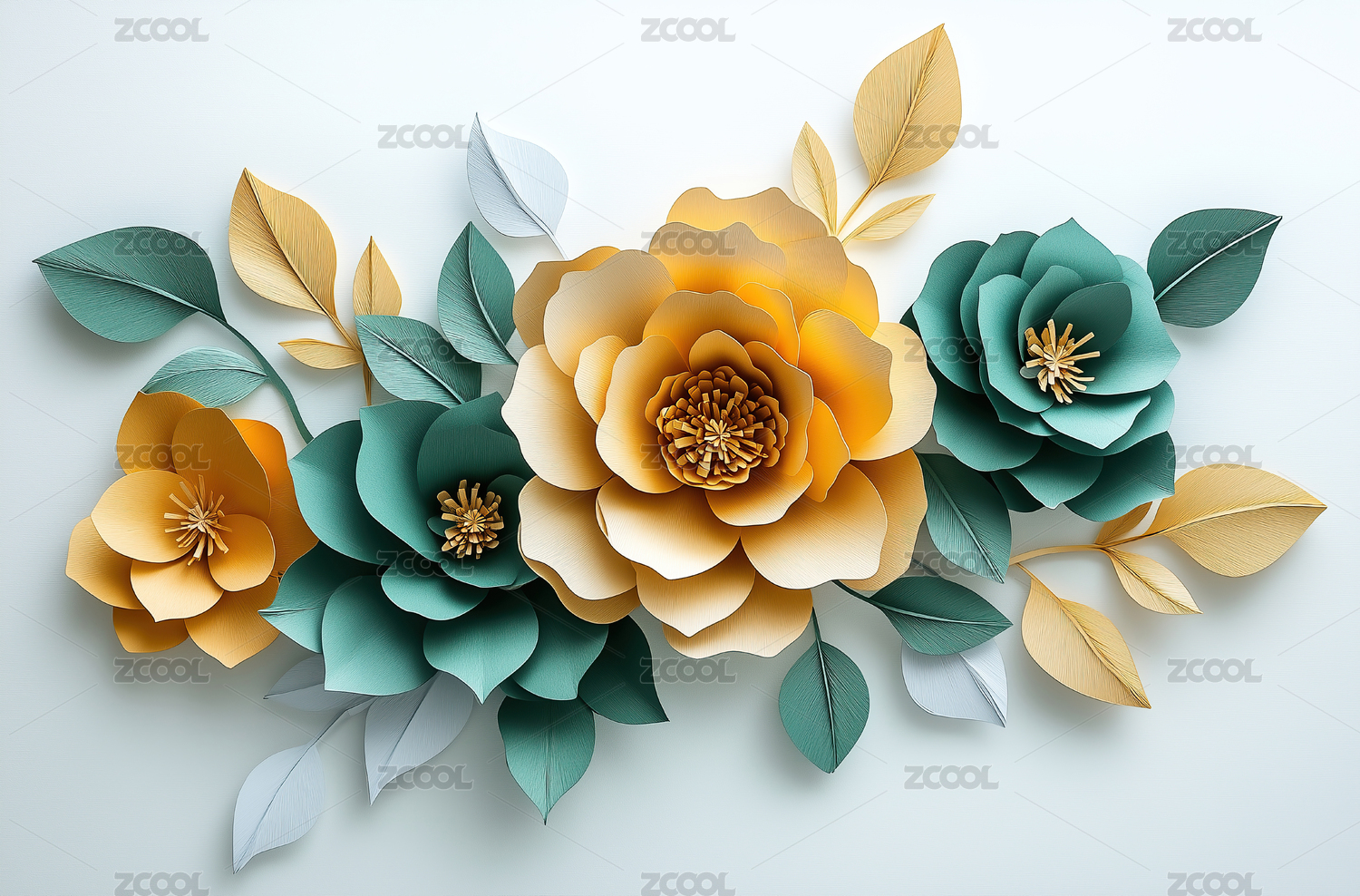 花朵和金色叶子立体插画
