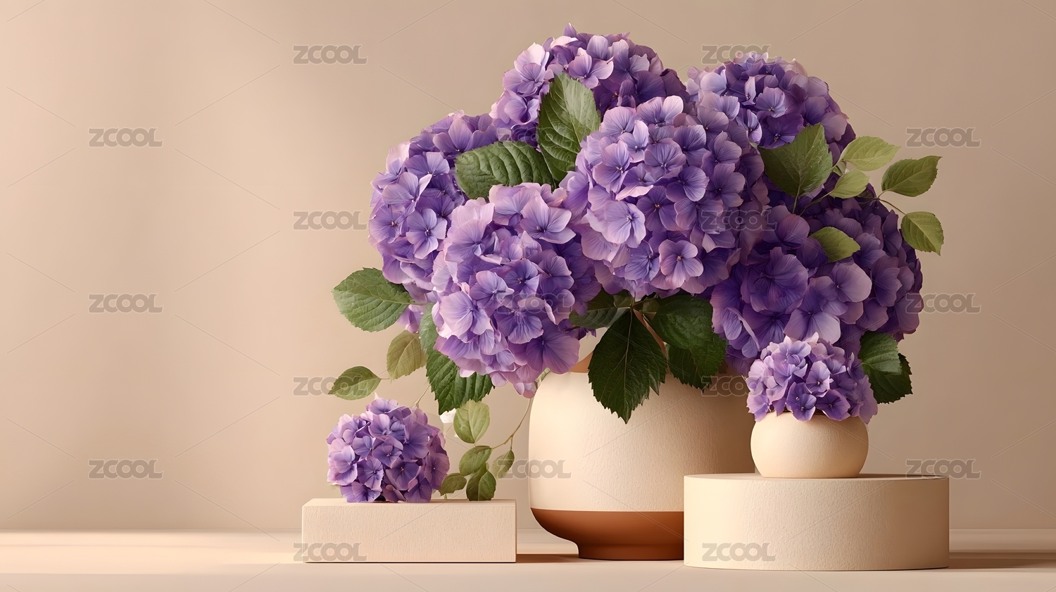 紫色绣球花与几何摆件组合