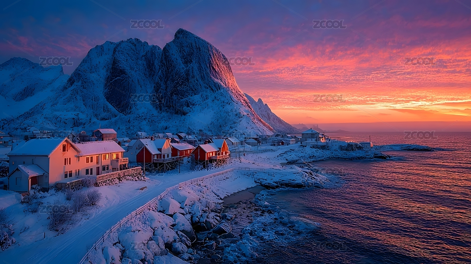 雪山渔村冬日黄昏