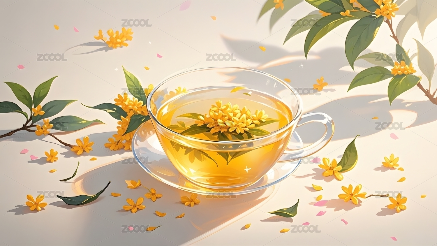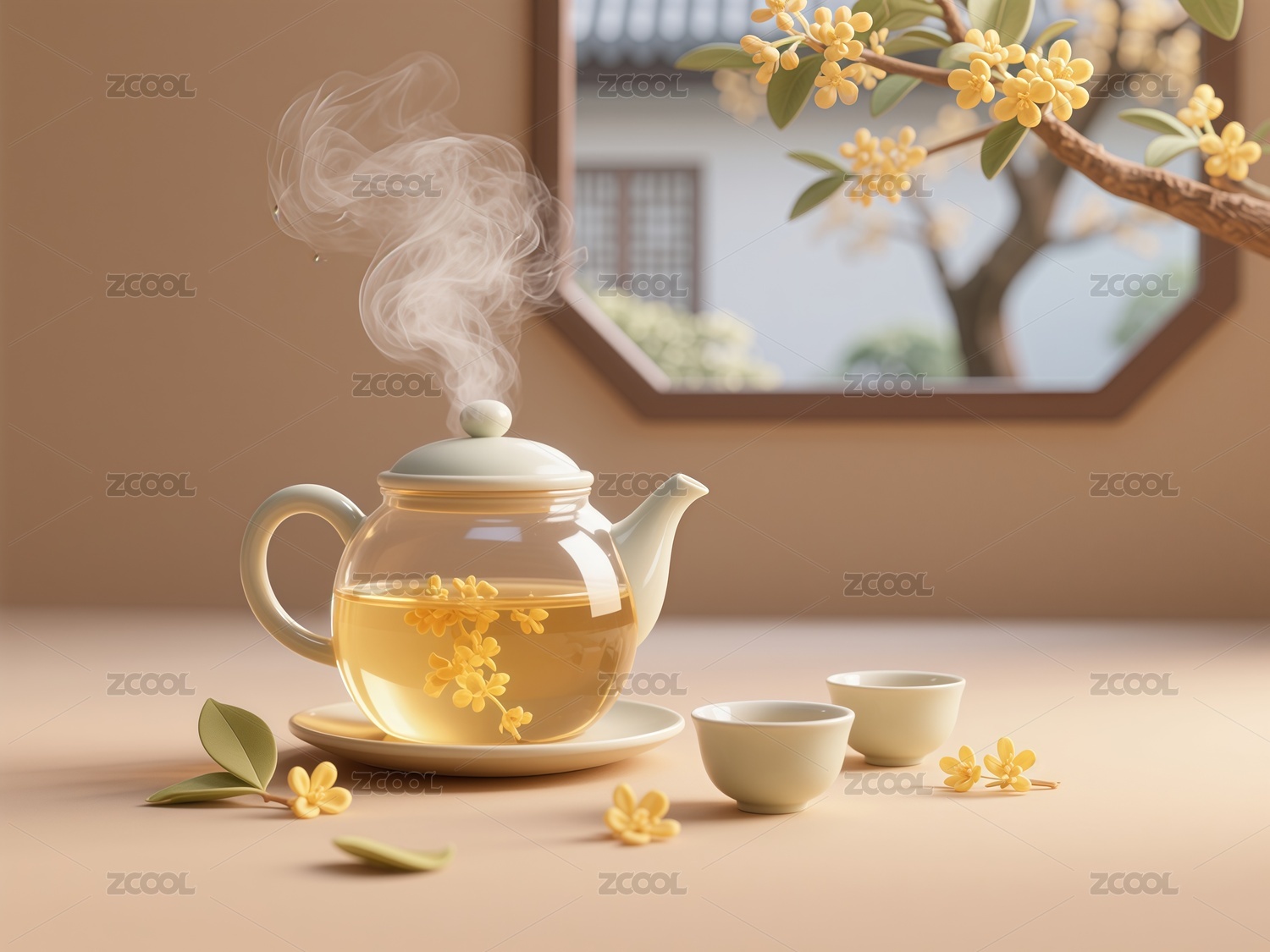 蒸汽缭绕中的玻璃茶壶与茉莉花茶