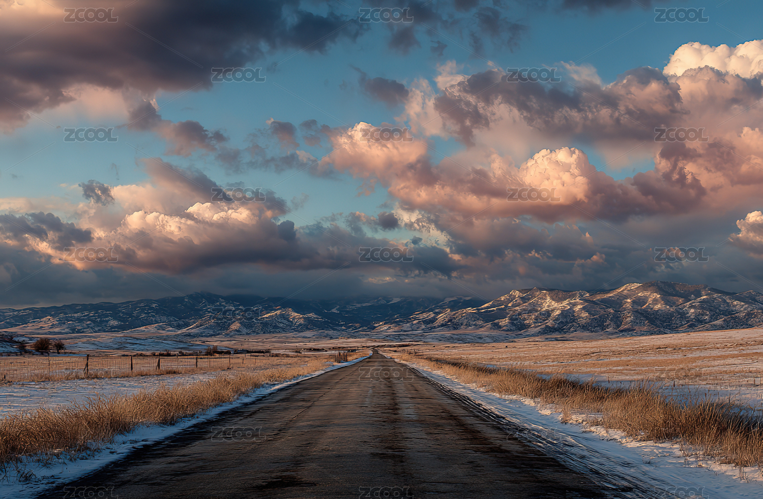 树木,雪景,远山,雪地,冷色调,冬季,山脉,山谷,公路,草地