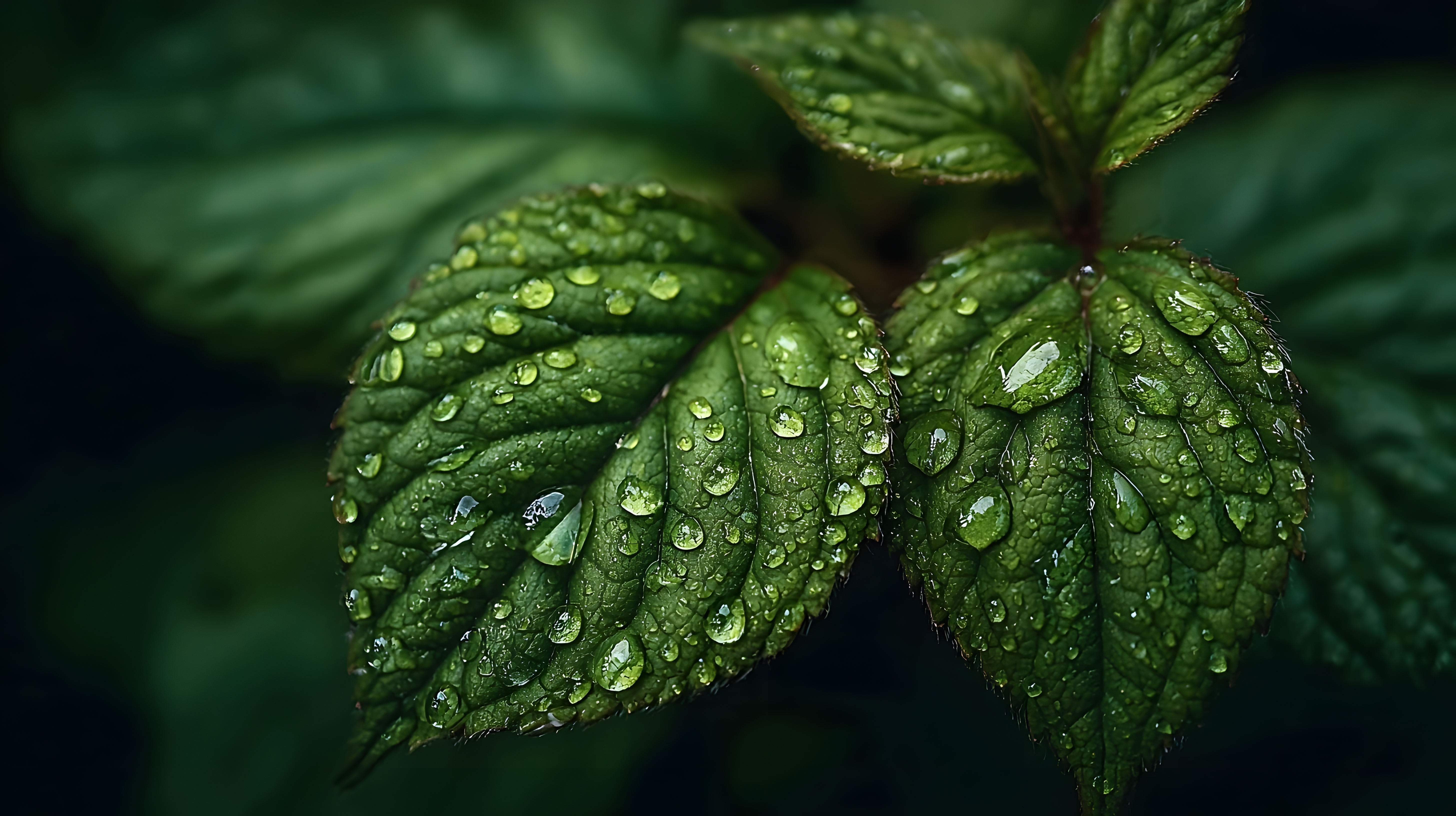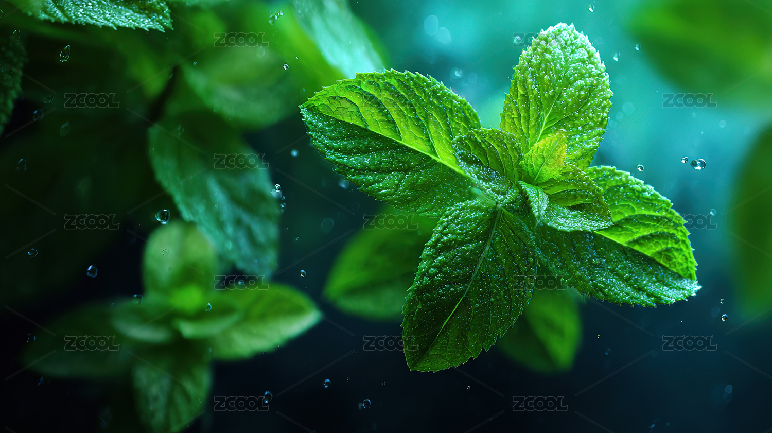 沾上水滴的薄荷叶子特写