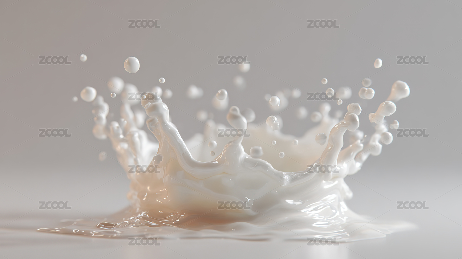 白色牛奶在灰色背景前飞溅 形成动态水花形