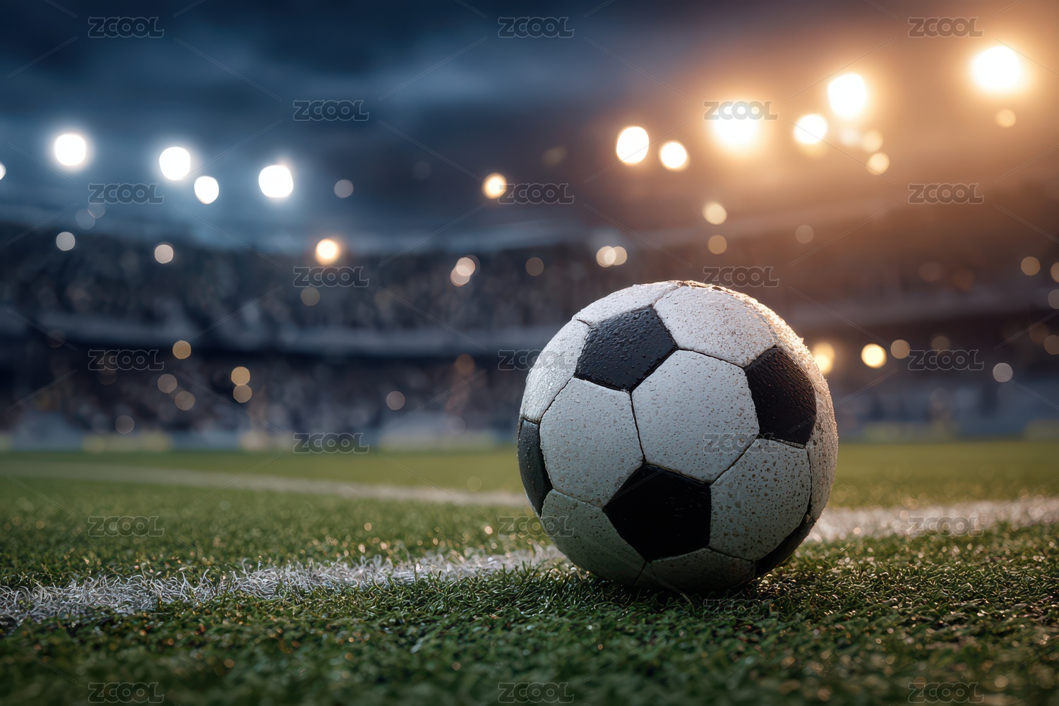 足球静置于绿茵场上的夜赛场景