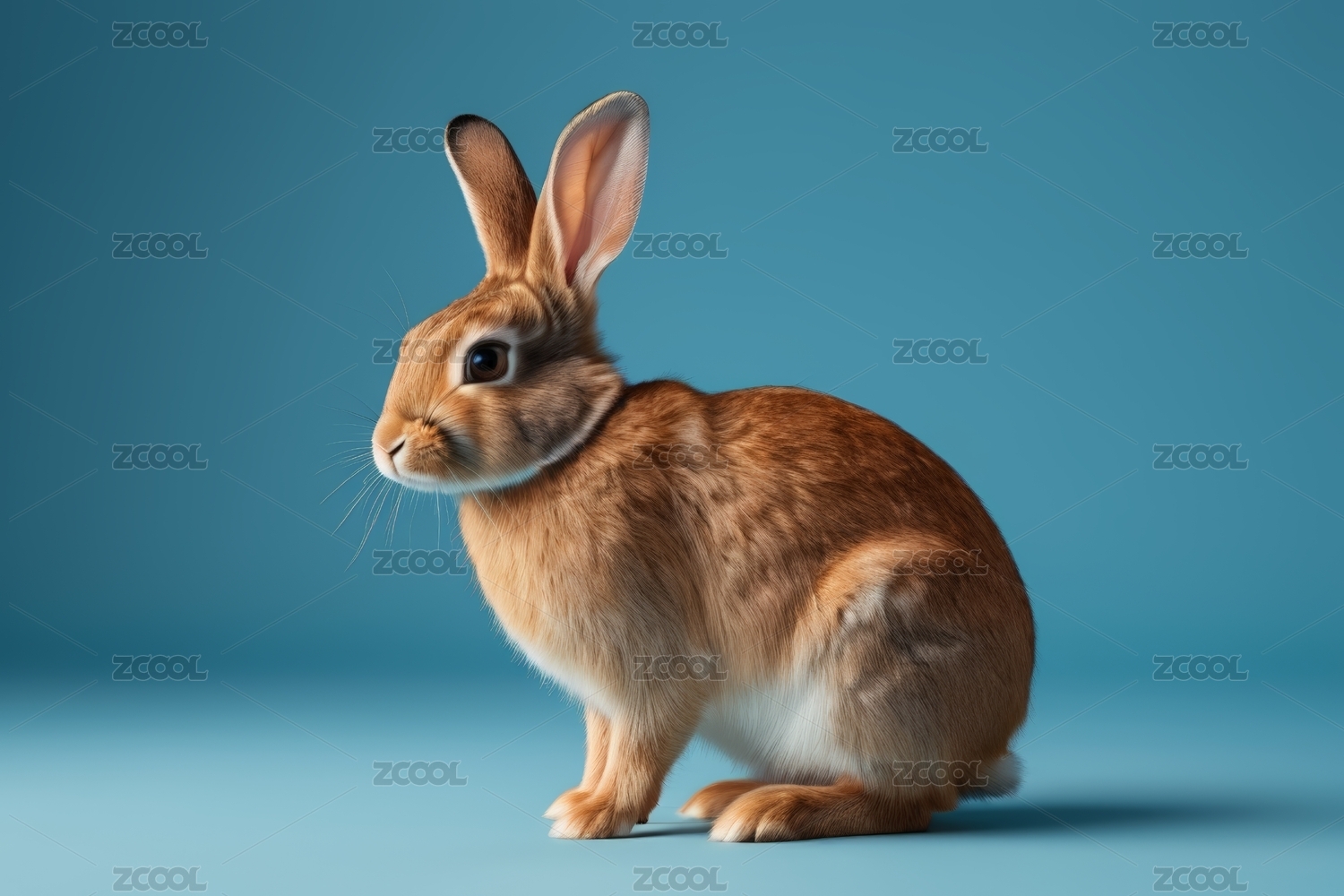 蓝色背景上着一只棕色兔子图片