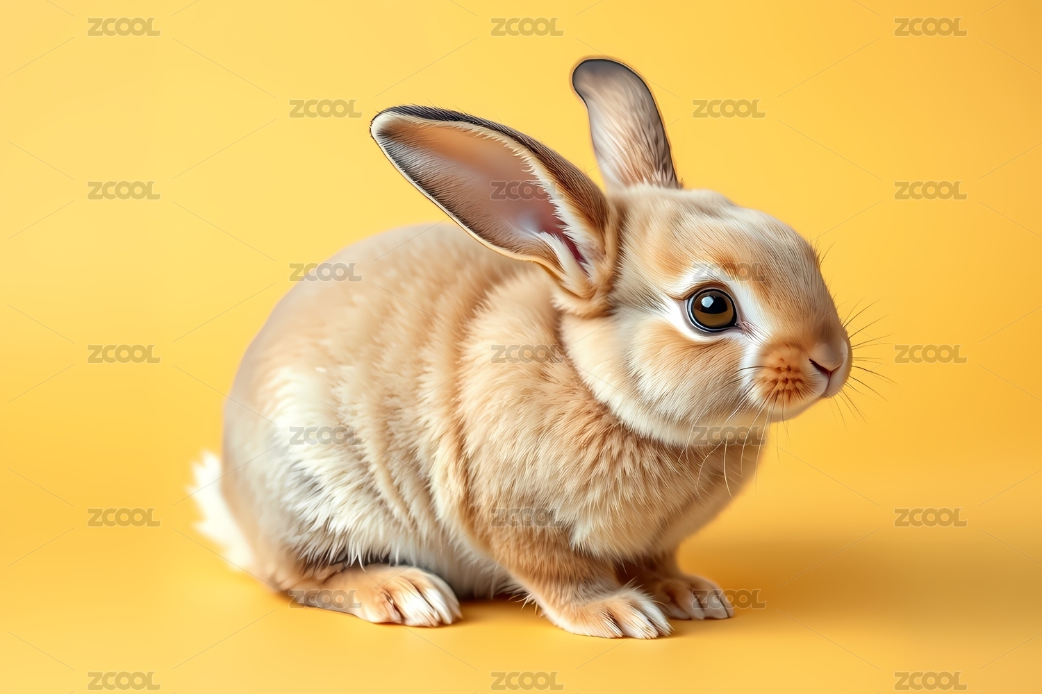 黄背景前可爱的棕色小兔子