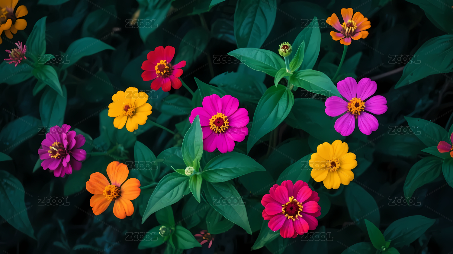多色花朵深色叶子背景