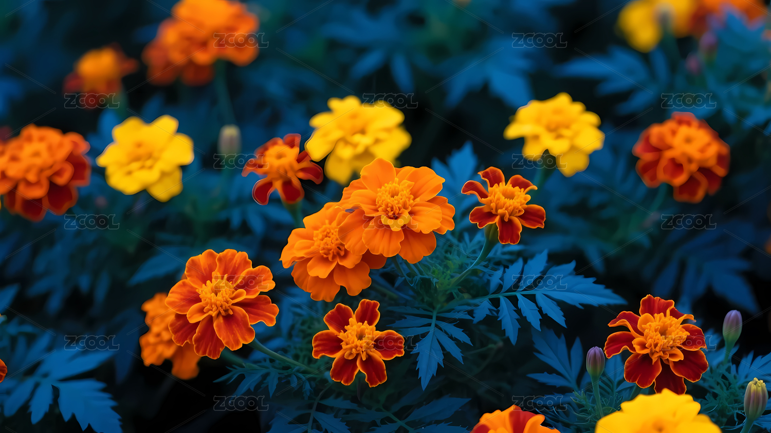 鲜艳花朵与深蓝叶子