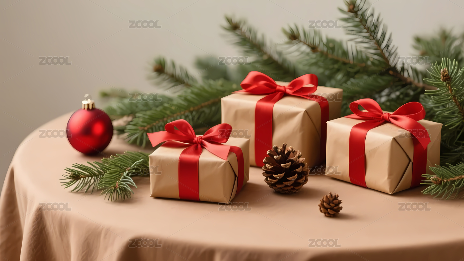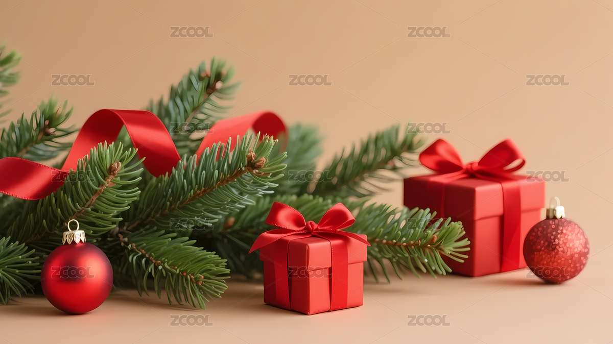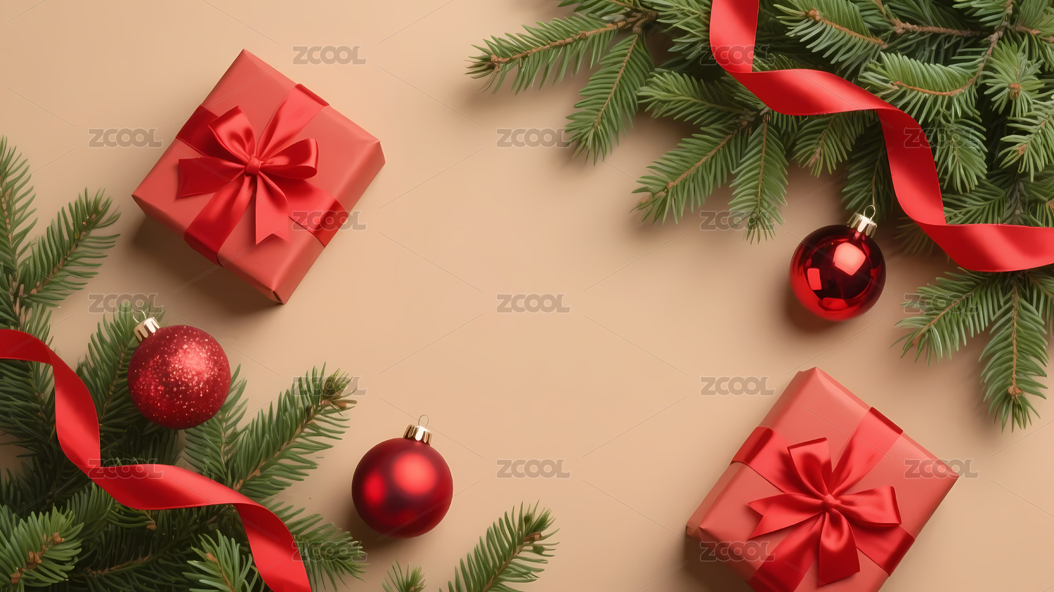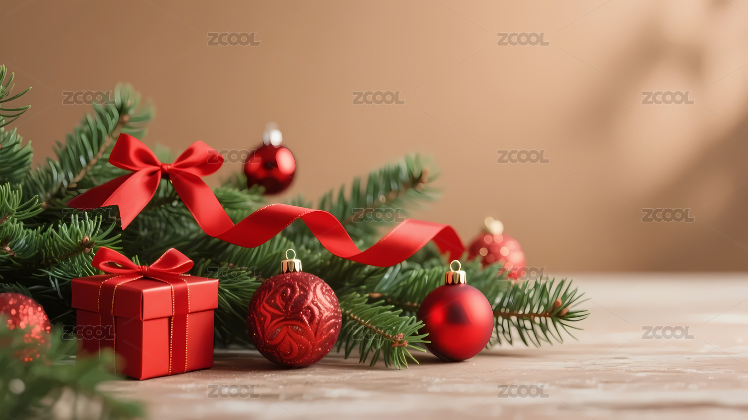 背景,礼盒,圣诞球,松树枝,节日,丝带,红色,浅棕,温暖,和谐