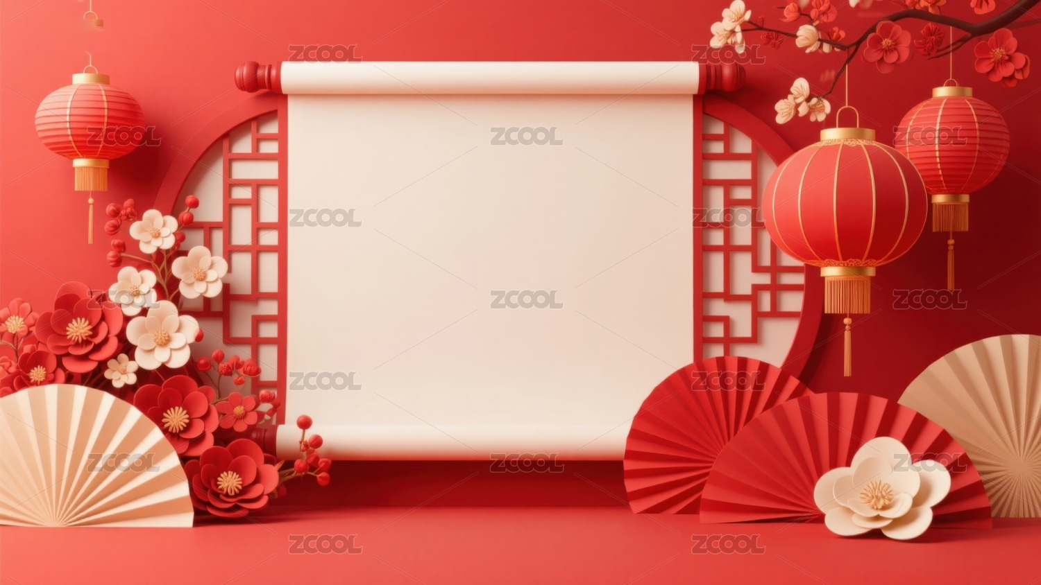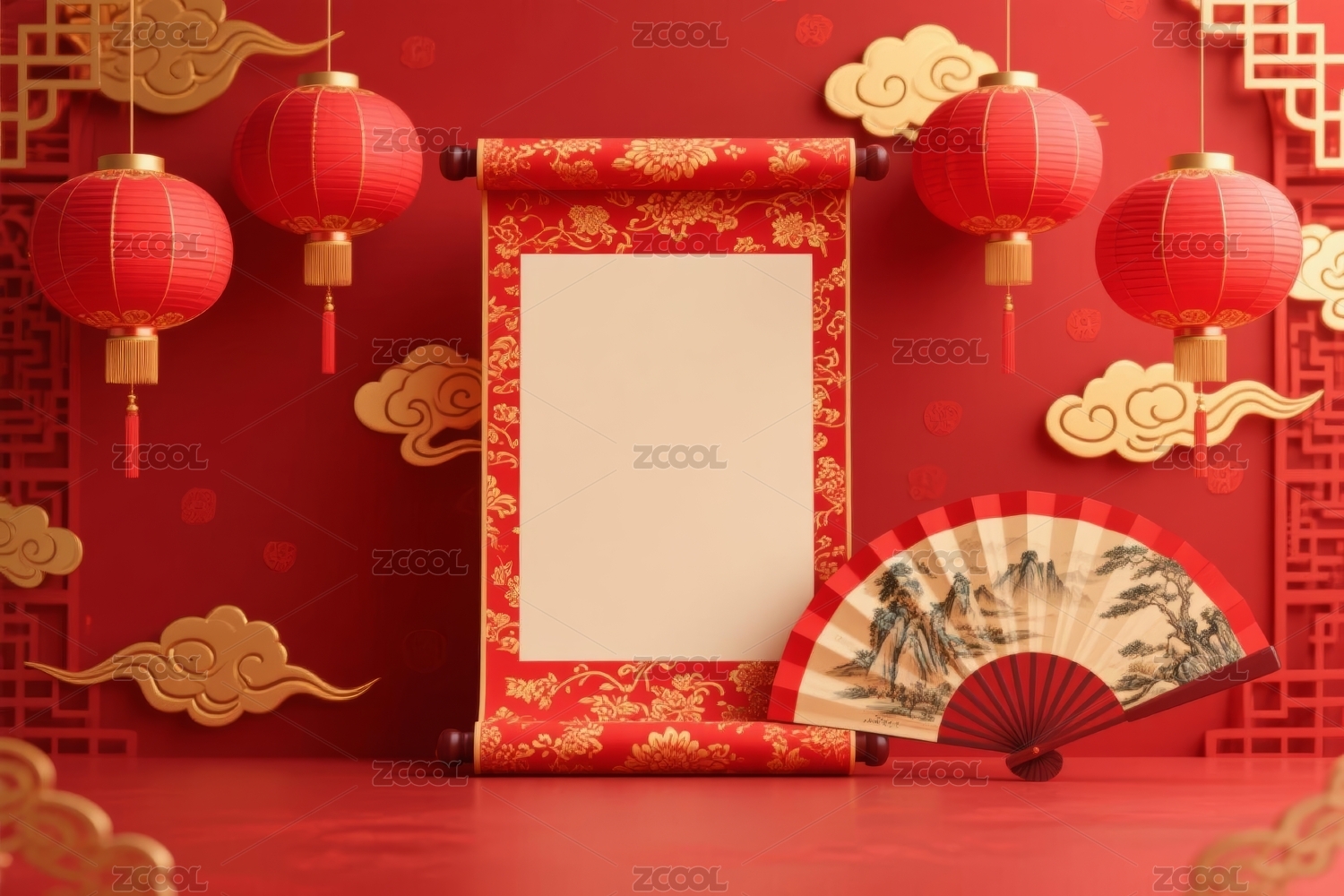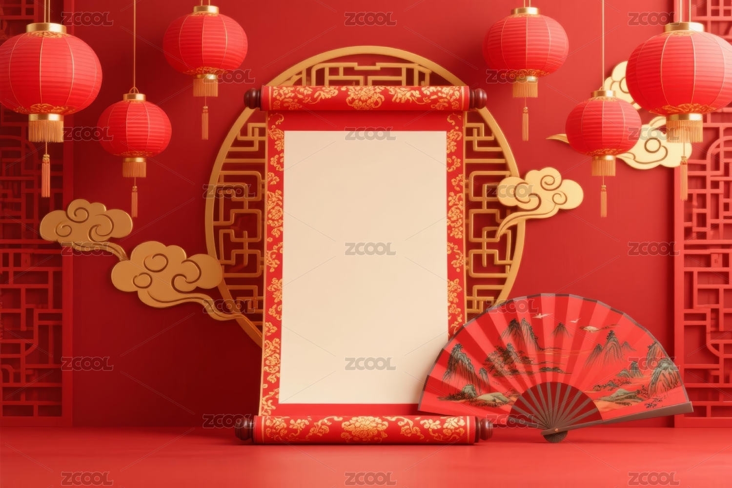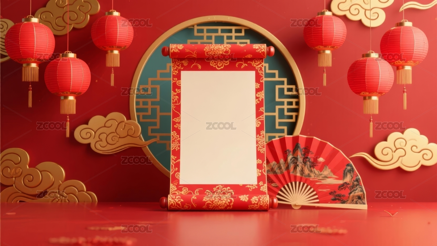 主视觉,商业,中式,喜庆,展示,场景,红色,灯笼,卷轴,祥云