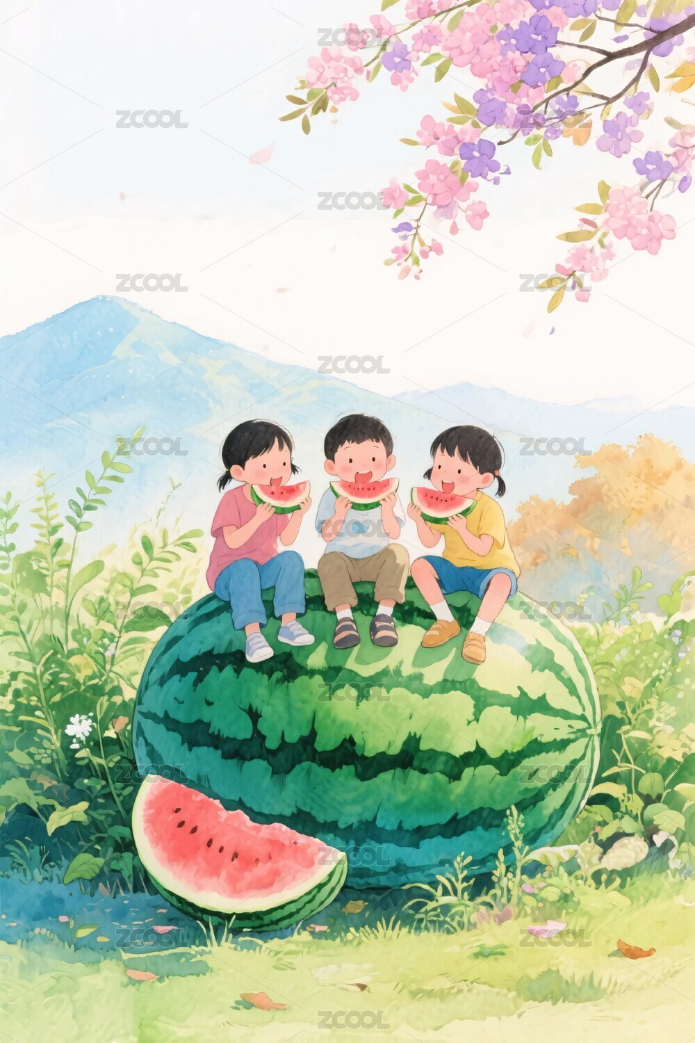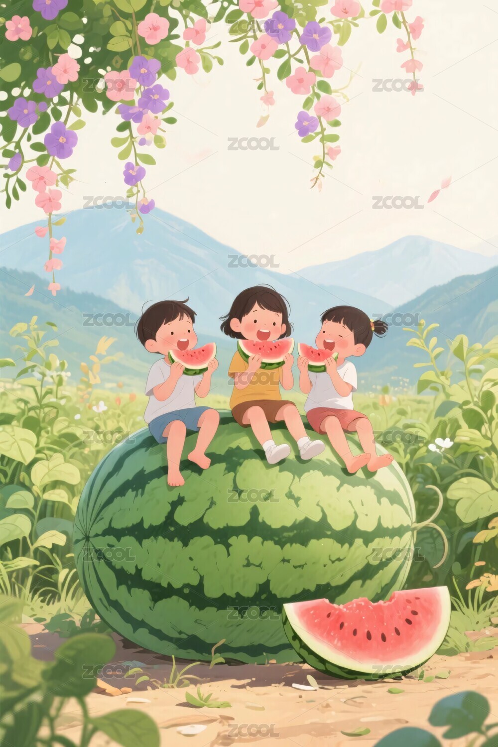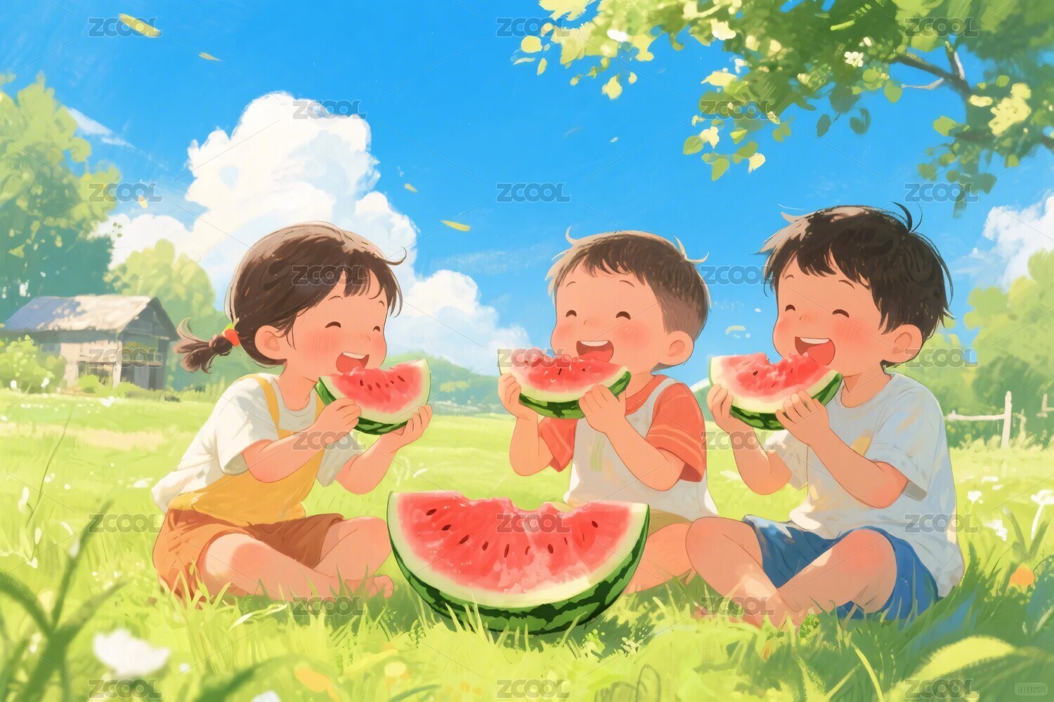户外亚洲儿童笑着抱着西瓜吃的清新卡通插画