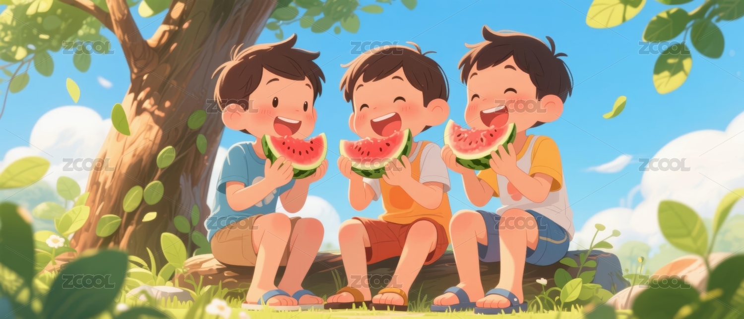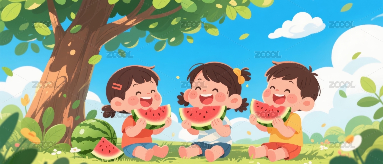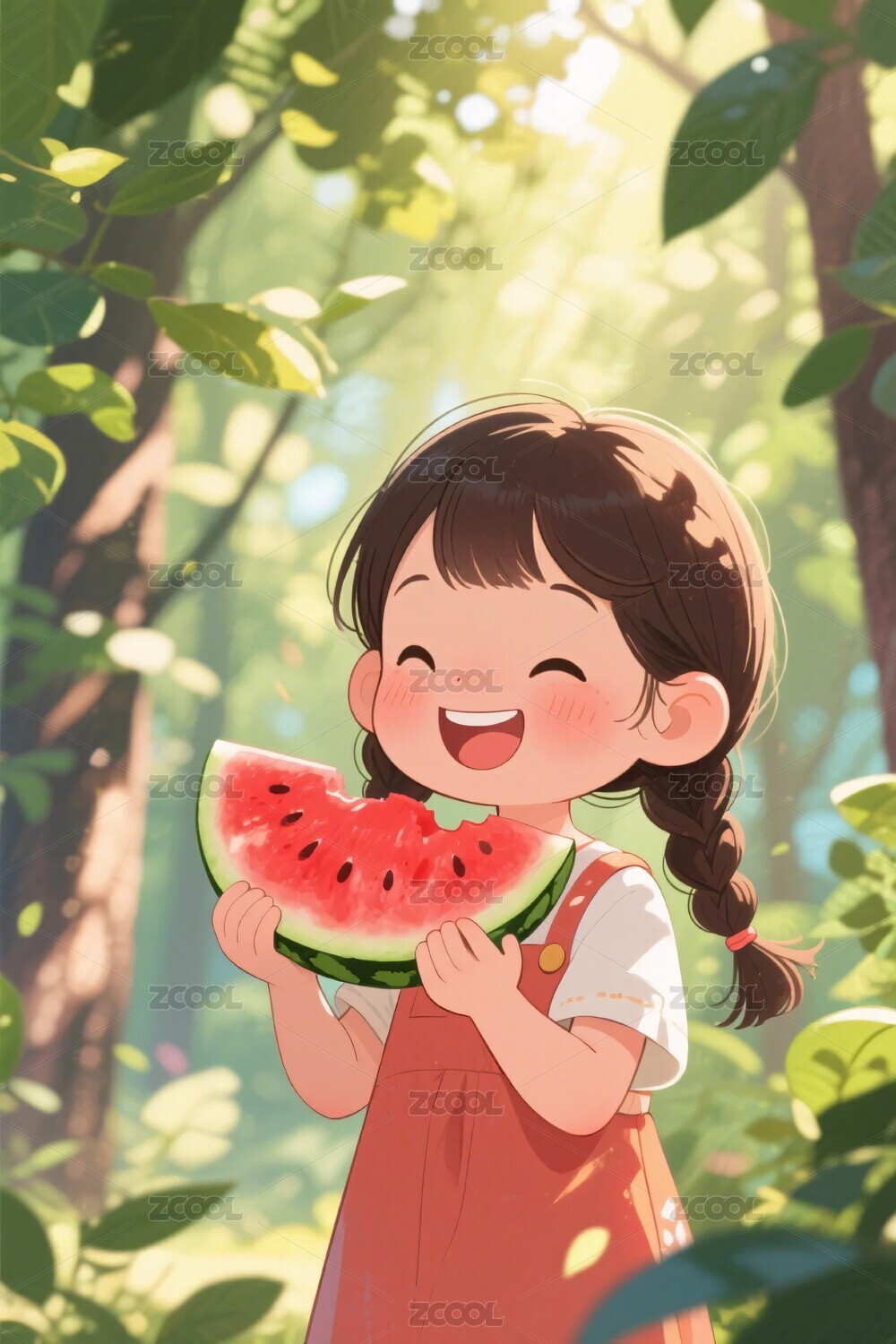 户外亚洲儿童笑着抱着西瓜吃的清新卡通插画