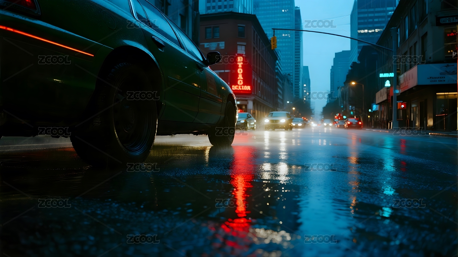 现代,建筑,夜晚,城市,街道,车辆,灯光,湿路,出租车,行人