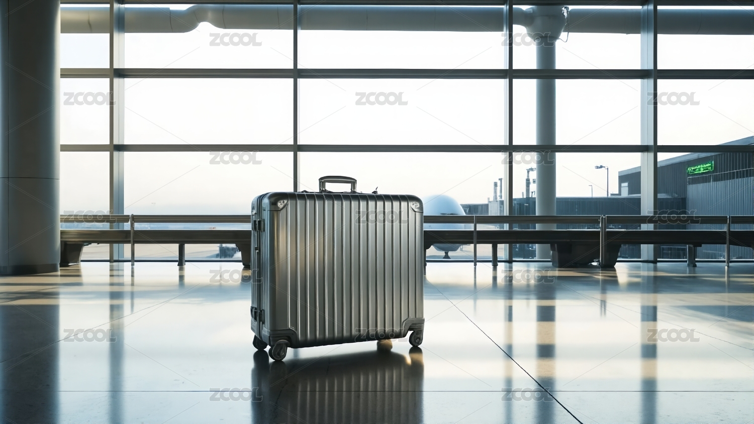 机场航站楼候机室内的银色旅行箱