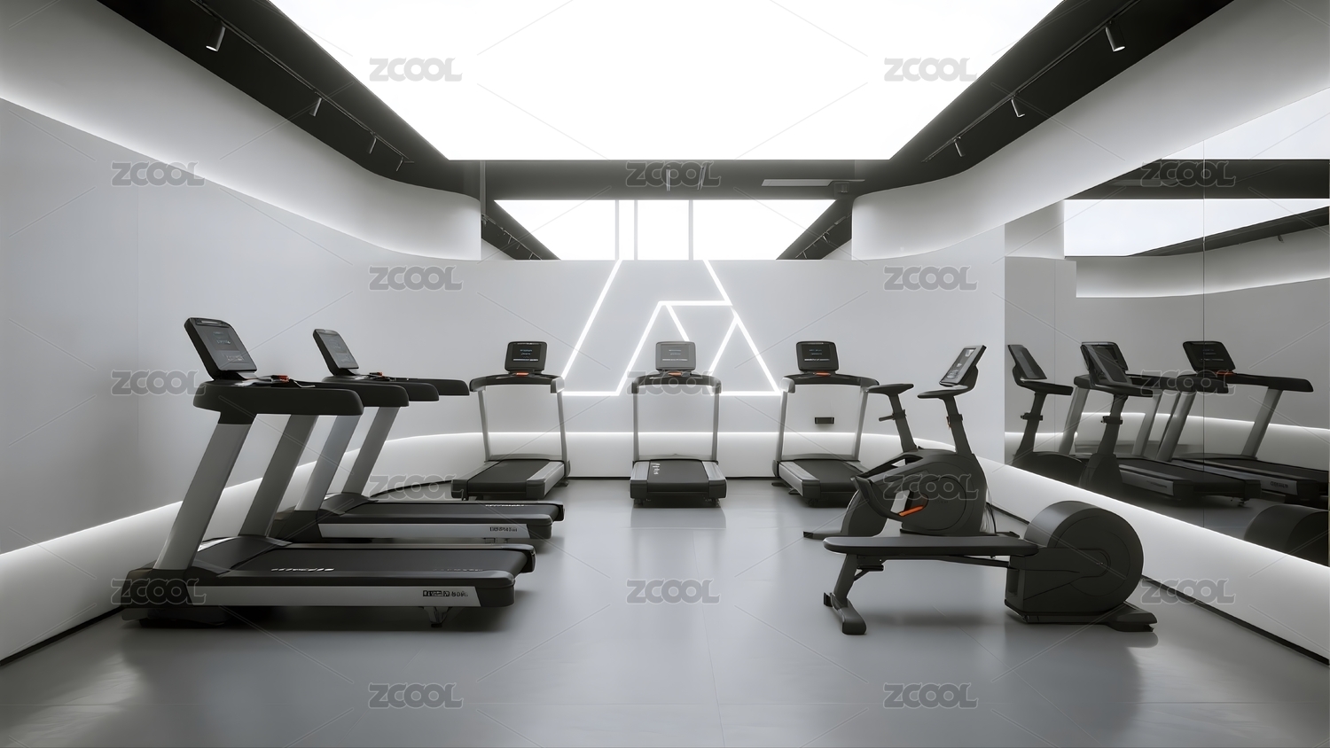 室内设计,现代风格,健身器材,灰色地板,健康生活,跑步机,运动场所,蓝色墙壁,明亮灯光,通风扇