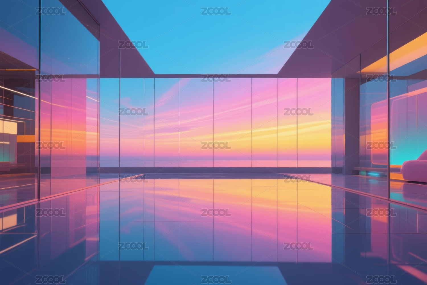 主视觉,商业,玻璃,建筑,梦幻感,观景,场景,晚霞,色彩,渐变