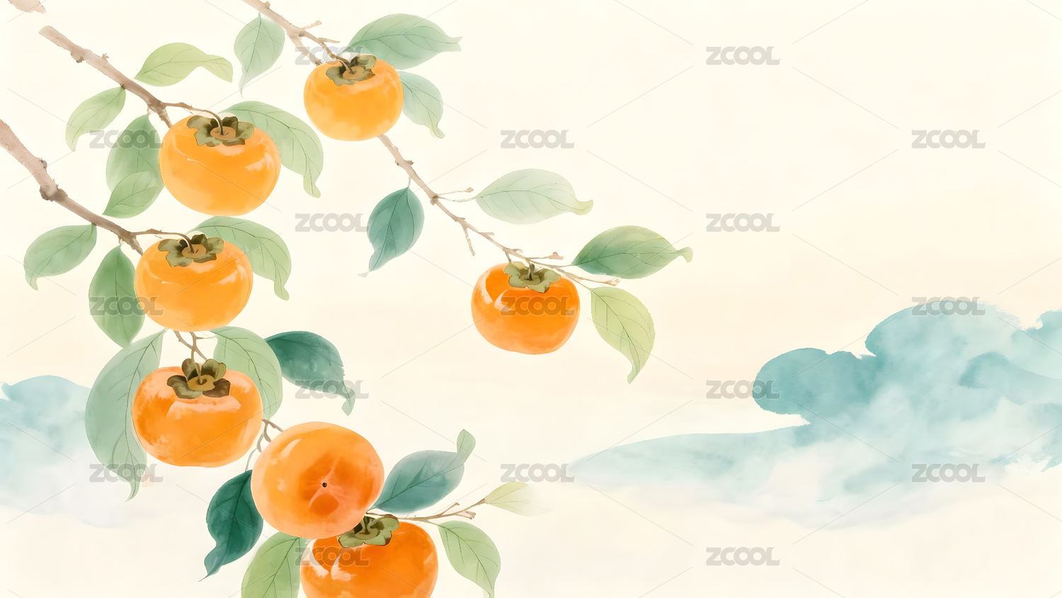 秋天霜降节气屋顶柿子树插画背景壁纸