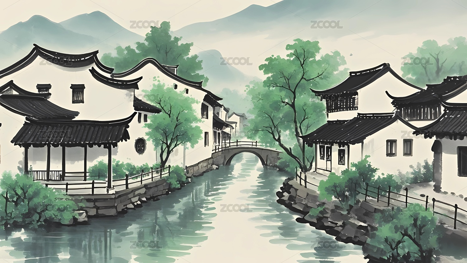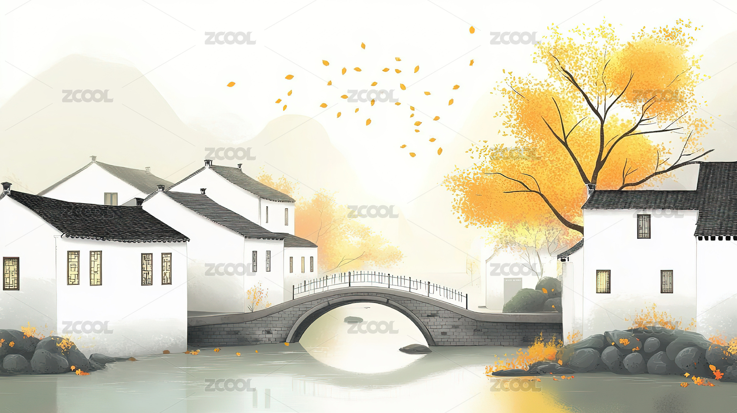 主视觉,商业,水乡,春景,诗意,画面,江南,建筑,粉花,红日
