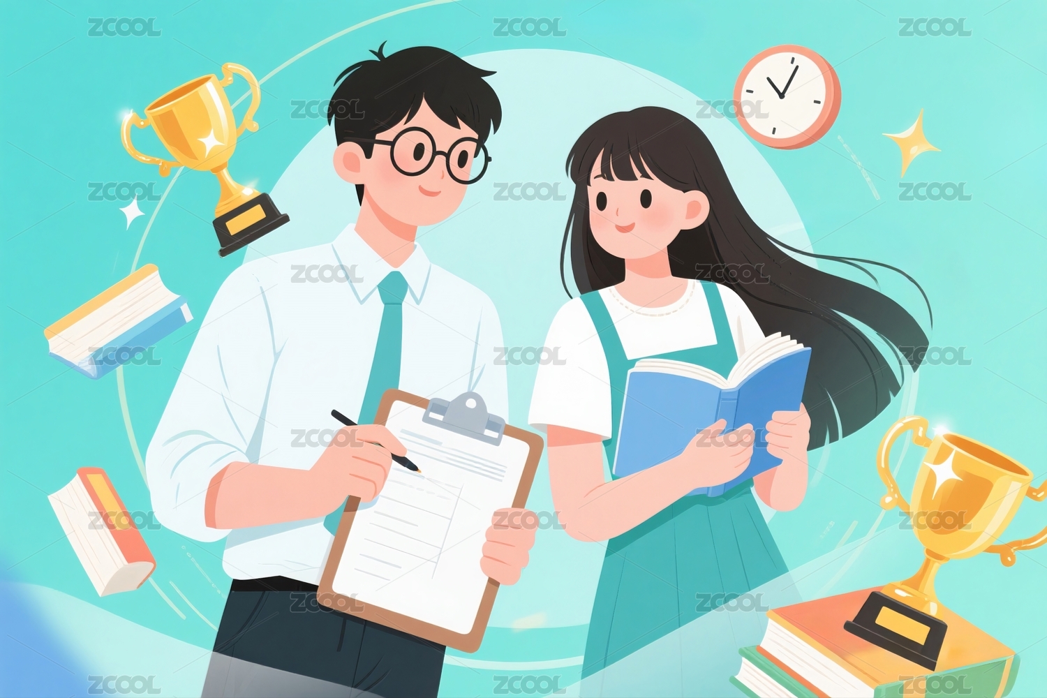 获得奖杯的学生插画